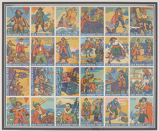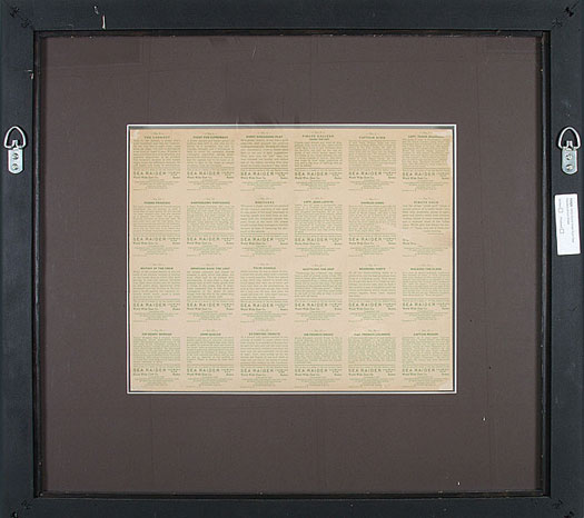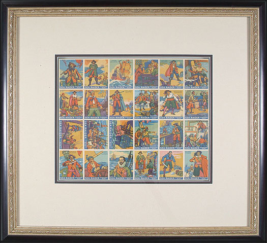 Ahoy Matey! Presented is an extraordinary complete 24-card original uncut sheet of 1933 R124 World Wide Gum (Canadian Goudey) "Sea Raiders" bubblegum cards, one of nonsport-card collecting's greatest classics. This is a complete production sheet with fully printed backs featuring all twenty-four cards from the R124 "Sea Raiders" low-number series (#1-24). Each card features an image of a legendary pirate (such as Blackbeard, Captain Kidd, Sir Henry Morgan, etc.) or a scene related to a pirate's lifestyle (such as "walking the plank") on the front. The back of each card features the biography for the pirate or a description of the pirate-related scene. This sheet displays beautifully! Bright and crisp, with brilliant colors, and a simply outstanding overall appearance. The sheet has a couple small creases in the lower right corner. Most of the interior cards are Nr/Mt-Mt. A few small areas of paper loss on the reverse affect the text of some cards and almost certainly relate to the sheet's storage long ago in the Goudey Gum Company archive file books (which were discovered and dispersed to the four corners of the collecting world in 1969). A true rarity and a prize nonsport sheet from one of the key gum-card issues of the 1930s. The sheet measures 14-1/4 x 11-1/2 inches and has also been very professionally and expensively double-side matted and framed (so both the front and back can be viewed) to dimensions of 25-3/4 x 23-5/8 inches. Reserve $1,000. Estimate (open). SOLD FOR $4,443.75