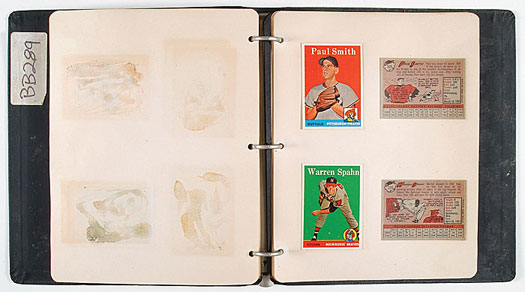 Presented is a three-ring binder housing 176 1958 Topps baseball cards from the files of the Topps Company, preserved and displayed in a very unique manner. This particular binder originally housed two examples of each card from #199 to 286 and includes such highlights as Warren Spahn, Frank Robinson, Richie Ashburn, Bill Mazeroski, Billy Martin, and New York Yankees Team. These are the actual file-copy cards kept by Topps for its archives. This binder was purchased at the famous 1989 Topps/Guernsey's auction and has not seen the light of day since. It has been consigned to this auction directly from the original purchaser! Each page in the binder was designed to display six cards (three different cards, displaying the front and back of each card) neatly mounted by means of glue on the reverse (some have been reinforced with clear tape along the top edge). Forty-three cards have become dislodged from the binder and are included loose. The cards are pack-fresh, right off the printing press, and (aside from being mounted) grade Nr/Mt overall. These cards naturally have a special historical significance as Topps file cards. In recent years, Topps has offered file cards and pages removed from albums individually (those not sold at the 1989 Topps auction) through The Topps Vault (on eBay) and these cards have sold for significant premiums. The cards could be professionally removed if desired. Total: 176 cards. Reserve $500. Estimate (open). SOLD FOR $4,147.50