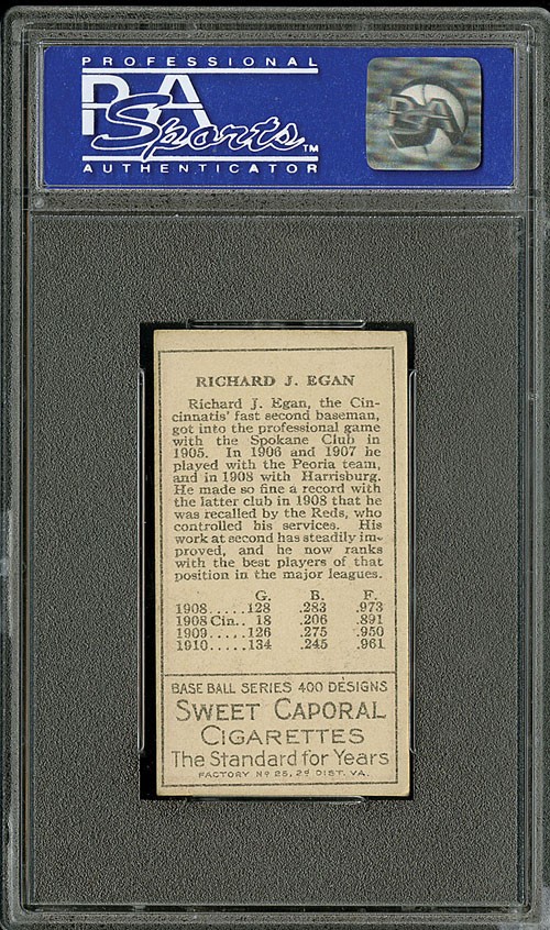 Richard Egan of the Cincinnati Reds. PSA NM 7. Sweet Caporal advertising reverse. This is one of just five examples graded at this level with only two graded higher out of 108 cards evaluated to date. Reserve $200. Estimate $400+. SOLD FOR $474