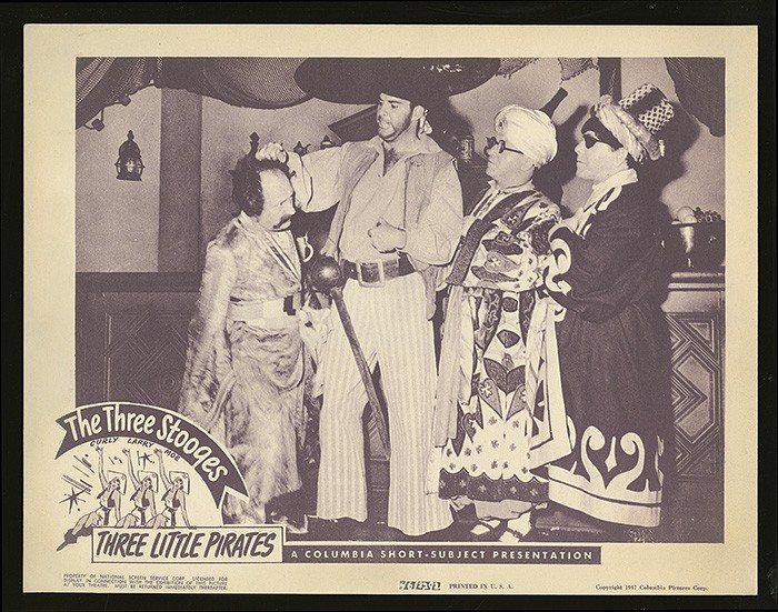 Lobby card from the Three Stooges 1946 short Three Little Pirates . This was the penultimate Three Stooges short featuring Curly. It is also widely considered their best film from 1946. The plot featured the boys as sailors on a garbage scow who wind up stranded on Dead Man's Island in 1672. During the course of their adventure, they disguise themselves as foreign travelers, with Curly playing the nearsighted Maharaja of Canarsie and Moe the Gin of Rummy. This was a routine they first performed in the 1941 musical comedy Time Out For Rhythm . The card (14 x 11 inches) has benefitted from restoration in the form of cleaning and airbrushing along the border areas. Near Mint in appearance.