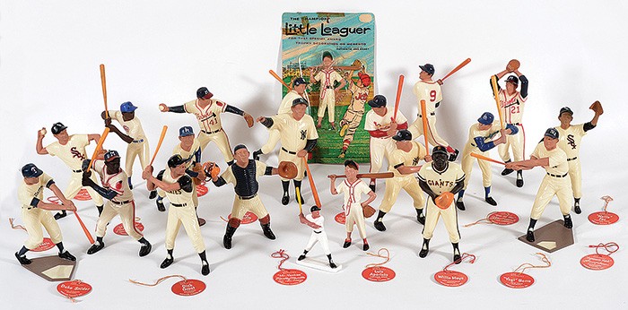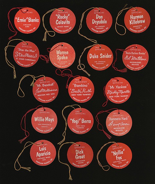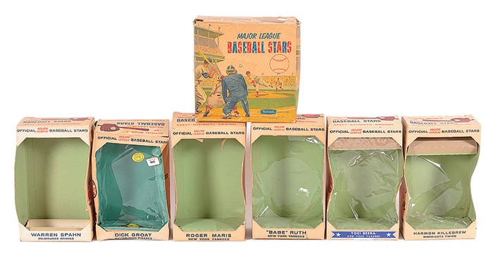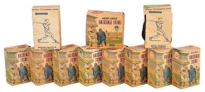 Eddie Mathews (Box: Gd with tape repairs; Tag: Vg); Dick Groat (Box: Fr, with flaps missing; Tag: Ex); Hank Aaron (Box: Ex; Tag: Ex); Willie Mays (Box: Gd-Vg; Tag: Vg); Rocky Colavito (Box: Ex-Mt; Tag: Vg); Duke Snider (Box: Ex; Tag: Vg); Don Drysdale (Box: Gd with tape repair; Tag: Vg); Harmon Killebrew (Box: Vg; Tag: Vg); Warren Span (Box: Gd-Vg with minor tape repair; Tag: Vg); Stan Musial (Box: Gd-Vg; Tag: Vg); Nellie Fox (Box: Vg-Ex with detached flap; Tag: Ex with price tag residue on reverse); Ted Williams (Box: Vg-Ex; Tag: Ex); Babe Ruth (Box: Vg-Ex; Tag : Ex-Mt); Luis Aparacio (Box: Fr-Gd with tape repair; Tag: Ex-Mt); Roger Maris (Box: Vg; Tag: no tag issued); Ernie Banks (Box: Vg-Ex; Tag: Ex); Mickey Mantle (Box: Ex; Tag: Ex-Mt); Yogi Berra (Box: Ex; Tag: Ex-Mt); Little Leaguer (Box/packaging: Gd with tape repair; Tag: no tag issued). SOLD FOR $15,600