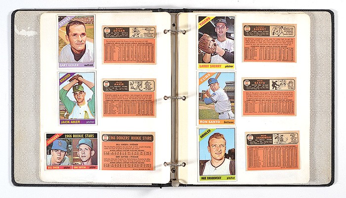 Presented is a three-ring binder housing 173 1966 Topps baseball cards from the files of the Topps Company, preserved and displayed in a very unique manner. This particular binder was originally designed to house two examples of each card from #265 to 351. Included are such highlights as Don Sutton RC, Ron Santo, Bob Gibson, Roberto Clemente (back copy only), and Frank Robinson (back copy only). These are the actual file-copy cards kept by Topps for its archives. This binder was purchased at the famous 1989 Topps/Guernsey's auction and has not seen the light of day since. It has been consigned to this auction directly by the original purchaser! Each page in the binder displays six cards (three different cards, displaying the front and back of each card) neatly mounted by means of glue on the reverse (a few have been reinforced with clear tape along the edges). The cards are pack-fresh, right off the printing press, and (aside from being mounted) grade Nr/Mt overall. A few cards from the latter part of the series show minor warping which is not distracting and is mentioned only for the sake of accuracy. These cards naturally have a special historical significance as Topps file cards. In recent years, Topps has offered file cards and pages removed from albums individually (those not sold at the 1989 Topps auction) through The Topps Vault (on eBay) and these cards have sold for significant premiums. The cards could be professionally removed if desired. Total: 173 cards. SOLD FOR $600