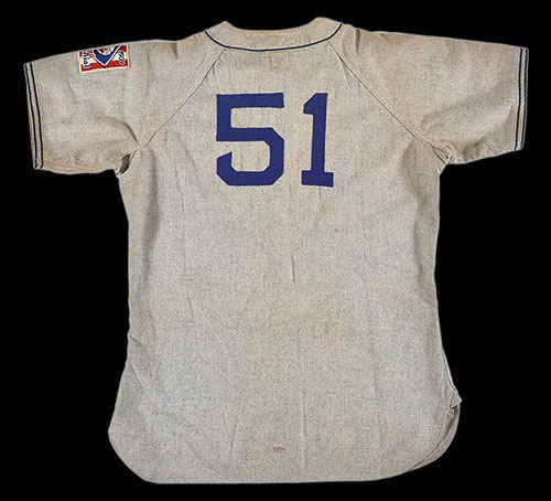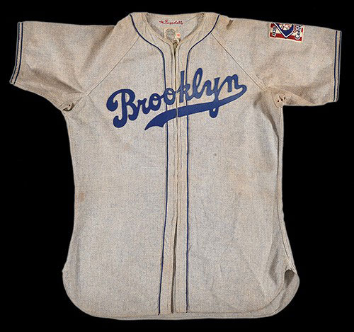 Brooklyn Dodgers road jersey issued to pitcher Bill Posedel in 1939. The gray flannel, zipper-front jersey is lettered "Brooklyn" on the front and features the number "51" on the reverse. All letters and numerals are appliquéd in blue felt. A 1939 "Baseball Centennial" patch adorns the left sleeve. The name "W. Posedell" (misspelled) is chain-stitched in red in the collar. Also located in the collar are a "Spalding" label, a "44" size tag, and a laundry tag. The year, "39," is chain-stitched in red on the rear tail. Bill Posedel made his major league debut with the Dodgers in 1938 as a thirty-two-year-old rookie, finishing the year with an 8-9 record. Right before the start of the 1939 season, on March 31, Posedel was traded to the Boston Bees. As a result, he never wore this uniform in 1939. His trade to Boston explains why the jersey displays the wrong uniform number. Posedel wore number "21" in 1938, but after his trade that number went to catcher Al Todd. As a result, the number "21" was removed from this jersey and replaced by the number "51." Since no player wore number "51" with the Dodgers in 1939, it is reasonable to assume that this jersey was simply kept on hand as an extra. Of course, it might have later been sent down for use in the minors and/or used during spring training in 1940; however, in those cases the patches are normally removed from the sleeves. Ideally, the desirable 1939 Centennial patch was left intact on this jersey, which greatly enhances its aesthetic appeal and makes it all the more desirable for advanced collectors. Aside from the number change, the jersey is complete as issued, and displays moderate wear, including minor soil stains and a few tiny tears. Reserve $1,000. Estimate $3,000++. SOLD FOR $2,015