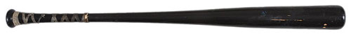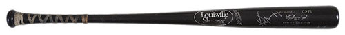 Ken Griffey Jr. Louisville Slugger signature-model ("C271") bat dating from the 1991-1997 manufacturing period. The bat, which is not cracked, displays moderate-to-heavy use along its entire length, including numerous ball marks (with ink transfers), grain swelling, deadwood on the front and back of the barrel, and a light application of pine tar. The bat also displays a few minor chips to the black finish. A wrap of white tape, done in Griffey's trademark "crisscross" pattern, extends 8 inches up the handle. Griffey has signed the bat in silver paint pen (grading "8") on the "sweet spot" of the barrel. Length: 33.75 inches. Weight: 29.8 ounces. Together with a New Era Seattle Mariners cap signed by Griffey in blue Sharpie ("9") on the top of the brim (Nr-Mt). Total: 2 items (bat and cap). LOA from James Spence/JSA (for the signatures only). Reserve $200. Estimate $400/$800+. SOLD FOR $1,185