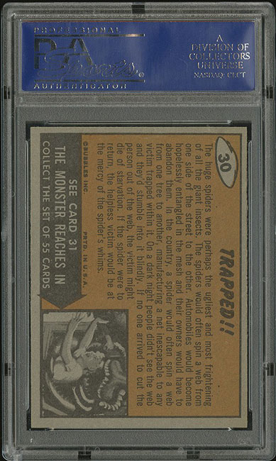Graded MINT 9 by PSA. One of only four examples graded at this level with none higher out of 260 cards evaluated to date. Ultra high-grade example of #30 "Trapped!" from the classic Topps "Mars Attacks" set, one of the most popular nonsport sets ever issued. Clean and crisp with bold colors, four sharp corners, and near-perfect centering. This is an outstanding ultra high-grade example that would upgrade virtually any "Mars Attacks" set in existence. Reserve $500. Estimate (open). SOLD FOR $1,896