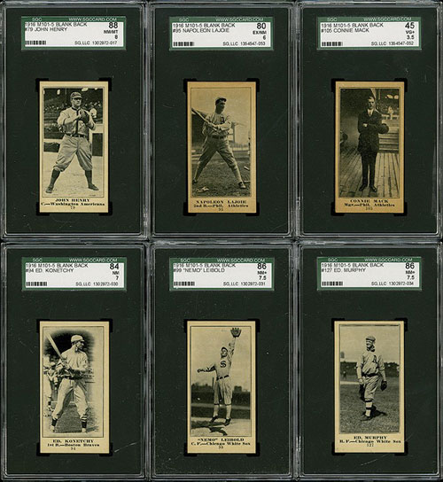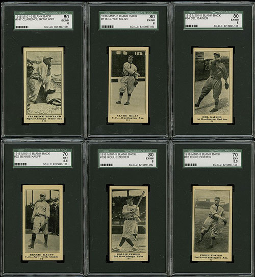 Collection of sixty-two different cards from the M101-5 Sporting News set, each professionally graded and encapsulated by SGC. The offered collection represents thirty percent of a complete 1916 M101-5 Sporting News set. The M101-5s, along with the closely related M101-4 set, are two of the most highly regarded and comprehensive baseball-card sets of the era. This is an extremely attractive group of cards with flawless real-photo images. Even the more modestly-graded examples present at a level better than suggested by their assigned grades. The collection consists of the following: EX/NM 80 (7 cards): #60, 64, 80, 104, 118, 147, and 198. EX+ 70 (9 cards): #62, 92, 96, 99, 102, 117, 124, 152, and 157. EX 60 (16 cards): #11, 46, 47, 48, 61, 63, 69, 73, 97, 113, 127, 141, 160, 162, 168, and 183. VG/EX+ 55 (15 cards): #13, 17, 38, 44, 65, 67, 70, 79, 111 Marsans, 121, 135, 165, 173, 191, and 199. VG/EX 50 (1 card): #18. VG+ 45 (4 cards): #58, 72, 94, and 119. VG 40 (4 cards): #24, 78, 132, and 138. GOOD+ 35 (2 cards): #93 and 156. GOOD 30 (1 card): #98. FAIR 20 (3 cards): #10, 50, and 129. All cards are blank-backed. This is an outstanding collection that could serve as a significant foundation for the assembly of a complete set or provide upgrades to any set or collection of these classic prewar cards. The equivalent SMR value (factoring in the seventeen half grades at the lower whole-grade level) is $2,418. Total: 62 cards.