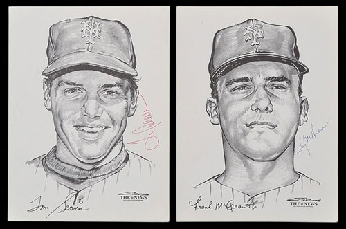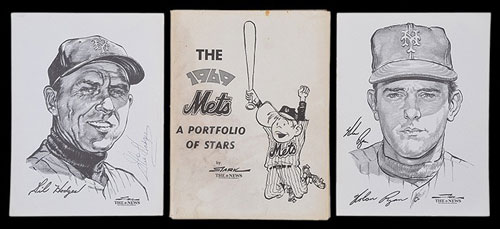 Issued by the the Daily News in 1969, the New York Mets "A Portfolio of Stars" set featured twenty individual portrait images housed within a paper folder. As noted on the front of the folder, all of the images were rendered by highly respected sports artist Bruce Stark. While the set is scarce (they could only be obtained in set form by mail through the Daily News at the time) the offered portfolio is far rarer and more significant in that each portrait has been personally signed by the respective player. This is the first autographed complete set of these portraits we have ever offered, and we cannot recall having ever seen another. The highlight portrait of the set as an autographed item is that of manager Gil Hodges, who died just three years later at the age of forty-eight. The Hodges portrait is accompanied by a full LOA from PSA/DNA, while the others are each accompanied by an individual COA from PSA/DNA. All of the signatures, penned in a variety of inks (mainly blue ink) appear on the front and grade "9" or "10." The players represented here are Hodges, Ryan, Seaver, Harrelson, C. Jones, Kranepool, McGraw, Koosman, Boswell, Agee, Clendenon, Shamsky, Taylor, Swoboda, Garrett, Gentry, McAndrew, Cardwell, Grote, and Weis. All of the portrait sheets (9 x 12 inches) display modest handling wear and are in Excellent condition overall. The folder (9.25 x 12.25 inches) is in Very Good condition. LOA from James Spence/JSA. Reserve $300. Estimate $500/$1,000. SOLD FOR $1,659