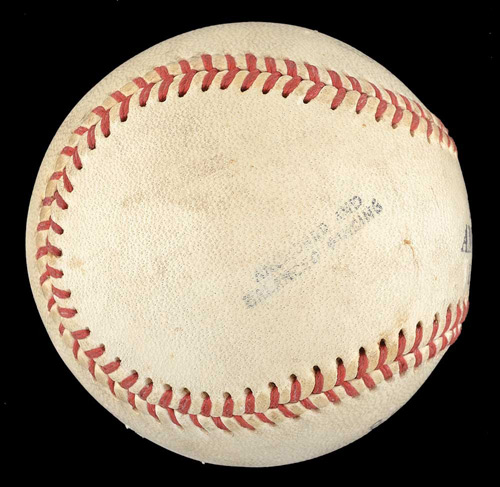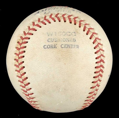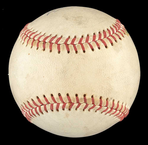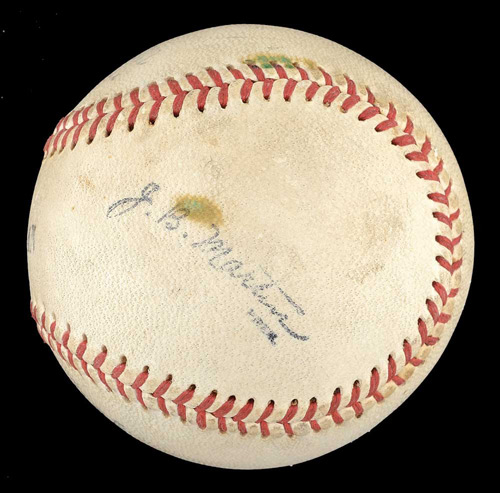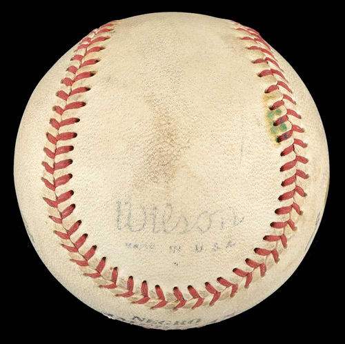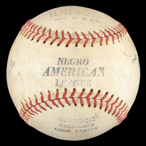 Exceedingly rare Wilson Official Negro American League baseball dating from circa 1950. The ball label reads "Negro American League" and the facsimile signature of the league president, "J. B. Martin," appears on a side panel. The Negro American League was formed in 1937 as a counterpart to the older Negro National League and it lasted for twenty-five years. J. B. Martin was president of the league from 1940 through 1961, its final year of existence. It is interesting that Spalding Bros., which had a monopoly on the official balls for both the American (under its Reach brand name) and National Leagues, failed to secure the rights for the Negro leagues as well. Instead, it was Wilson that won the contract and the company supplied the balls for both the Negro National and American leagues for most of each organization's existence. This is only the second Negro American League ball we have ever offered. The first, which was still in its original, unopened box, appeared as Lot 1289 in our Spring 2014 auction, where it sold for $5,629. The ball displays moderate surface wear, including two small areas of discoloration. In Very Good to Excellent condition overall.