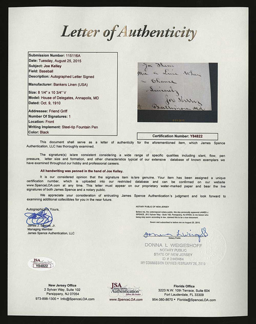 Both the text and signature are boldly scripted in black fountain pen and grade "10." While we cannot state with certainty, the "Griff" to whom this letter is addressed may be Clark Griffith, who was manager of Cincinnati at the time. Kelley was player/manager of the Toronto Maple Leafs (Eastern League) in 1910 and managed the club for a few more seasons before accepting a scouting job with the Yankees in 1915. His last baseball job was as a coach with Brooklyn in 1926. Kelley, of course, made his fame as one of the top players on the Baltimore Orioles of the late 1890s. Teaming with John McGraw, Wee Willie Keeler, Wilbert Robinson, and Hughie Jennings, Kelley helped lead the Orioles to four pennants and two World Championships between the years 1894 and 1897. Joe Kelley signature examples are extremely scarce today. Handwritten letters are rarer still. The primary reason for the extreme rarity of Kelley's signature today is timing. In addition to playing his career in an era in which signature collecting was not very popular, Kelley passed away in 1943, and he wasn’t elected to the Hall of Fame until 1971. For nearly thirty years he was simply forgotten by autograph collectors. That lack of foresight by earlier collectors has resulted in Kelley's signature becoming a "holy grail" for anyone trying to assemble a substantial Hall of Fame autograph collection. While we cannot state with certainty exactly how many Joe Kelley letters exist today, the number is certainly quite small. This is only the second we have ever offered and we cannot recall having seen more than one other at auction during the past fifteen years. The letter (8.25 x 11 inches) displays one horizontal and two vertical folds, as well as two tiny interior holes. In Excellent condition overall. Full LOA from James Spence/JSA. Reserve $2,000. Estimate $5,000++.