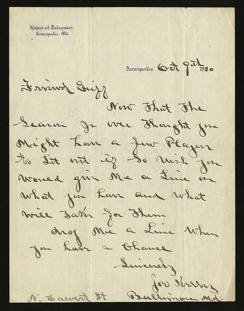 Rare one-page handwritten letter, dated October 9, 1910, signed by Hall of Fame outfielder Joe Kelley. In his letter, written to "Griff," on "House of Delegates, Annapolis, Md." letterhead, Kelley makes inquiries regarding available players for the upcoming season. In full: