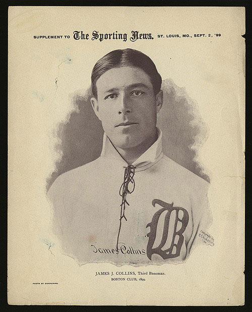 Extremely rare and significant example of Hall of Famer Jimmy Collins from the highly regarded M101-1 Sporting News premium set, issued in 1899. This sepia-toned premium set was issued with the Sporting News between the years 1899 and 1900. The fact that this rare premium issue is designed with a biography on the reverse makes this set all the more substantial. Each premium was issued on only a single day and is dated in the upper right. They were intended to be collected over a period of months, as issued, and their purpose was to provide extra value and to encourage loyalty among readers of the Sporting News . Their method of issue and the thin paper stock on which they are printed make these unusual and striking premiums particularly susceptible to damage. The fact that these premiums were each issued on only a single day with the Sporting News , as opposed to being offered in set form or over a longer period of time, makes their significant rarity very understandable. The Collins premium was issued only on September 2, 1899, and features the future Hall of Famer as a third baseman for the Boston Beaneaters. The premium's central image is outstanding, with only a few minor flaws, including creasing and tiny tears along with scattered paper loss on the reverse, rendering the premium technically modest in grade. The M101-1 Sporting News set, designed with a biography on the reverse exactly like traditional card issues produced in later years, is much more "card-like" than most other premium issues. In fact, of special significance is the fact that M101-1 is the very first set featuring Major League baseball players that is designed with biographies on the reverse at all, a design element that in the years to follow came to be a standard defining feature of many baseball-card sets. Not all collectors recognize premiums as cards due to their size and thin stock, but for those that do not make this distinction, the M101-1 Sporting News premium of Hall of Famer James Collins would be a worthy addition. Dimensions: 8.75 x 11 inches. Reserve $200. Estimate (open).