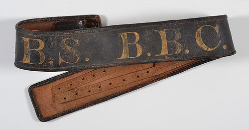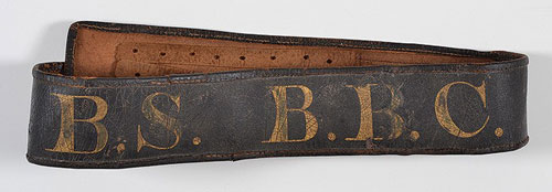 Rare nineteenth-century baseball-uniform belt dating from the earliest days of organized baseball. The most distinguishing feature of this black-leather belt is the team name, reading "B. S. B. B. C.," painted in gold on the front. The fact that this belt actually displays the initials "B. B. C." is highly significant. Many similar-style belts from the era display just a name, such as "Empire" or "Knickerbocker," and therefore cannot be definitely identified as having been part of a baseball uniform. The reason for that relates to the manner in which many early baseball clubs were formed. Most of the men's social clubs at the time were simply extensions of each neighborhood or town's local fire company. As baseball rose in popularity, those social clubs also sponsored baseball teams. Thus, many of the earliest baseball teams were composed of firemen. Alexander Joy Cartwright himself, one of the founding fathers of baseball, was a member of the New York Knickerbockers Fire Fighting Brigade several years before the Knickerbockers baseball team ever took the field in 1845. The early connection between fire companies and baseball is the reason why many early baseball uniforms were designed in the style of fire uniforms (often displaying a shield design on the front of the jersey). As a cost-cutting move, members would then use the belts from their fire uniforms with their baseball uniforms. For that reason, most early nineteenth-century firefighters"™ belts are indistinguishable from baseball belts. That is not the case here! This belt is clearly designated as having been worn by a member of a baseball team by the initials "B. B. C." (Base Ball Club). Unfortunately, the exact identity of the team will probably never be known ("B. S." could refer to any number of towns or organizations throughout the country). Nevertheless, it remains an exceedingly rare nineteenth-century baseball belt and only the second example we have seen with defining "baseball club" lettering or markings. The belt (36 x 2.75 inches) is well worn, displaying a number of cracks and abrasions along the semi-hardened leather. Both the buckles and straps remain completely intact. Very Good condition overall. Reserve $300. Estimate (open). SOLD FOR $1,200