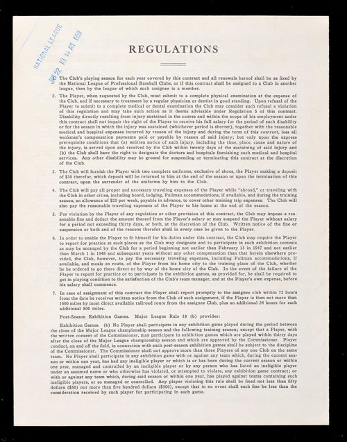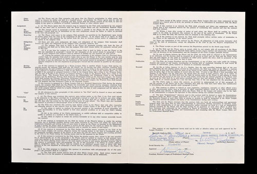 Four-page fold-over contract, dated January 12, 1959, between Eddie Mathews and the National League Baseball Club of Milwaukee, Inc., signed in blue ink by "Edwin L. Mathews" (grading "10"), "John J. Quinn" ("10"), general manager of the club, and National League president Warren Giles (“9/10”). The one-year agreement calls for Mathews to receive a salary of $50,000. Mathews certainly earned his salary that season, as he finished the year with a league-leading 46 home runs, 114 RBI, and a career-high .306 batting average. One of baseball's greatest sluggers, Mathews amassed a total of 512 home runs over the course of his seventeen-year career (1952-1968). He was elected to the Hall of Fame in 1978. Baseball contracts of Hall of Fame players, especially those dating from their respective playing careers, are rare. This is only the second Mathews contract we have ever offered. The contract (8.5 x 11 inches) displays two horizontal folds and is otherwise in Near Mint condition. Auction LOA from James Spence/JSA. Opening Bid $500. Estimate $2,500+.