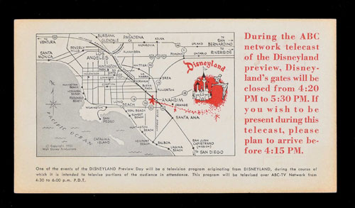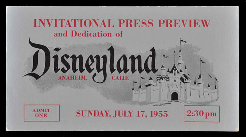 Rare invitational press ticket to the dedication of Disneyland on July 15, 1955. The large-format silver-colored ticket features an illustration of Cinderella's castle on the front, while the reverse includes a road map of southern California (the Disneyland location is prominently noted). Two separate announcements on the reverse specifically mention that the dedication will be telecast live on television by the ABC television network (ABC had minority ownership stake in the park). This is the first Disneyland opening day ticket we have ever offered and we cannot recall having seen more than just a few others. Disneyland opened exactly one year and one day after construction began on the iconic theme park, and the dedication was viewed by an estimated 70 million viewers at the time (the population of the United States was approximately 165 million in 1955). Even though the park was plagued by numerous problems on opening day (none of which were seen by television viewers), the park was a smashing success and it took only a few months for attendance to exceed one million visitors. Disneyland is one of the most iconic vacation destinations for families world wide, making this a historically significant piece of American culture and one that would be at home in any number of diverse collectible fields. The ticket (6.5 x 3.5 inches) displays light handling wear, including a few tiny creases and edge wear, as well as light toning on the reverse. In Excellent condition overall. Reserve $200. Estimate (open).