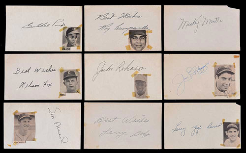 A partial list of the non Hall of Fame players is as follows: Johnny Antonelli, Bobby Avila, Joe Astroth, Bob Addis, Bobby Adams, Joe Adcock, Cal Abrams, Jack Bruner, Johnny Bero, John Berardino, Tommy Byrne, Lou Brissie, Matt Batts, Al Benton, Ray Boone, Hank Borowy, Gene Bearden, Bobby Brown, Hank Bauer, Neil Berry, Harry Byrd, Floyd Baker, Vern Bickford, Paul Burris, Jimmy Bloodworth, Tommy Brown, Frankie Baumholtz, Smokey Burgess, Ewell Blackwell, Dan Bankhead, Jack Banta, Rex Barney, Wayne Belardi, Ralph Branca, Ted Beard, Steve Bilko, Cloyd Boyer, Harry Brecheen, Ray Coleman, Merrill Combs, Sam Chapman, Bob Chakales, Chico Carrasquel, Bill Connelly, Paul Calvert, Bob Cain, Jerry Coleman, Joe Collins, Allie Clark, Joe Coleman, Gil Coan, Walker Cooper, Del Crandall, Bubba Church, Bob Chipman, Dave Cole, Billy Cox, Sam Calderone, Pete Castiglione, Bill DeMars, Jim Delsing, Walt Dropo, Dom DiMaggio, Joe Dobson, Bob Dillinger, Sam Dente, Dick Donovan, Al Dark, Murry Dickson, Luke Easter, Hoot Evers, Bob Elliott, Del Ennis, Bruce Edwards, Hank Edwards, Ed Erautt, George Estock, Carl Erskine, Cliff Fannin, Dick Fowler, Ferris Fain, Tom Ferrick, Dee Fondy, Howie Fox, Eddy Fitzgerald, Ned Garver, Mike Garcia, Bill Goodman, Randy Gumpert, Gordon Goldsberry, Johnny Groth, Ted Gray, Mickey Grasso, Frank Hiller, Cid Gordon, Joe Garagiola, Jim Hegan, Ken Holcombe, Ralph Houk, Bobby Hogue, Johnny Hopp, Frank House, Tommy Henrich, Bob Hooper, Bill Hitchcock, Sid Hudson, Mickey Harris, Larry Holmes, Roy Hartsfield, Gene Hermanski, Joe Hatten, Kirby Higbe, Jim Hearn, Clint Hartung, Grady Hatton, Solly Hemus, Dixie Howell, Bill Howerton, Jackie Jensen, Howie Judson, Earl Johnson, Eddie Joost, Ernie Johnson, "Puddin Head" Jones, Ransom Jackson, Larry Jansen, Nippy Jones, Spider Jorgenson, Bill Kennedy, Bob Kennedy, Ellis Kinder, Al Kozar, Don Kolloway, Charlie Keller, Bob Kuzava, Jack Kramer, Ed Klienman, Lou Klein, Alex Kellner, Clyde Klutz, Jim Konstanty, Johnny Klippstein, Dave Koslo, Ted Kluszewski, Johnny Lindell, Sherm Lollar, Dale Long, Stan Lopata, Max Lanier, Johnny Lindell, "Peanuts" Lowrey, Dutch Leonard, Ed Lopat, Whitey Lockman, Danny Litwhiler, Vern Law, Vic Lombardi, Billy Martin, Danny Murtaugh, Gil McDougald, Cliff Mapes, Barney McCosky, Dale Mitchell, Less Moss, Phil Masi, Minnie Minoso, Hank Majeski, Wally Moses, Mike McCormick, Sam Mele, Gene Mauch, Willard Marshall, Russ Meyer, Ed Miksis, Don Mueller, Sal Maglie, Roy McMillan, Bobby Morgan, Marty Marion, Irv Noren, Steve Nagy, Bill Nicholson, Don Newcombe, "Stubby" Overmire, Joe Ostrowski, Luis Olmo, Mickey Owen, Joe Page, Mel Parnell, Billy Pierce, Jerry Priddy, Bob Porterfield, Erv Palica, Andy Pafko, Howie Pollet, Mel Queen, Allie Reynolds, Vic Raschi, Stan Rojek, Del Rice, Al Rosen, Eddie Robinson, Saul Rogovin, Aaron Robinson, Buddy Rosar, Bob Ramazzotti, Willie Ramsdell, Preacher Roe, Pete Reiser, "Spec" Shea, Roy Sievers, Dick Starr, Harry Simpson, "Stuffy" Stirnweiss, Bob Swift, Vern Stephens, Johnny Sain, Charlie Silvera, Bobby Shantz, Pete Suder, Fred Sanford, Sibby Sisti, Ebba St. Clair, Curt Simmons, Dick Sisler, Roy Smalley, Eddie Stanky, George Shuba, Birdie Tebbetts, Dizzy Trout, Virgil Trucks, Henry Thompson, Bobby Thomson, Wayne Terwilliger, Johnny Vander Meer, Mickey Vernon, Bill Voiselle, Gene Woodling, Harry Walker, Wally Westlake, Vic Wertz, Bucky Walters, Eddie Waitkus, Wes Westrum, Rube Walker, Bill Werle, Ed Yoost, Al Zarilla, and Gus Zernial. Total: 450 signed index cards. Auction LOA from James Spence/JSA. Reserve $300. Estimate (open).
