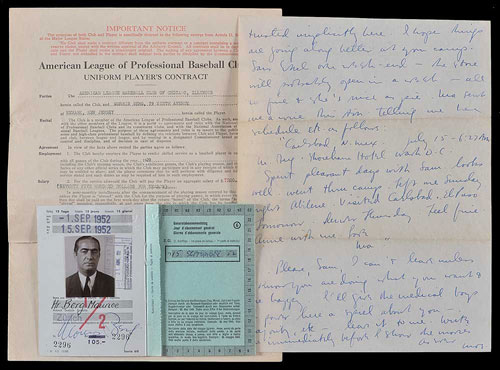 This collection of material relating to Moe Berg is comprised of a handwritten letter, a passport, a signed "Personal History Statement" (government application), handwritten notes for a speech in 1963, and an unsigned 1929 Chicago White Sox contract.