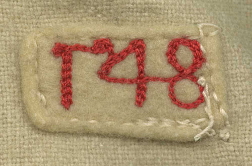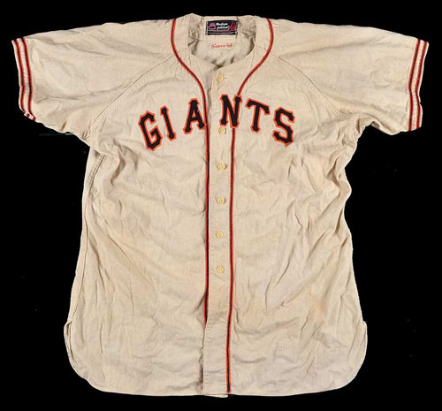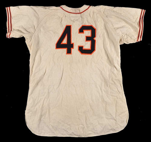 New York Giants home jersey issued to pitcher Mario Picone in 1948. The white flannel jersey features "Giants" across the front and the number "43" on the reverse. All letters and numerals are appliquéd in black on orange felt. A "MacGregor/Goldsmith 44" label appears in the collar. The numerals "1 48" (denoting the set number and year) are chain-stitched in orange upon a small white strip tag located on the interior left front tail. The jersey, which is original as issued, with no alterations, displays moderate wear, including a few loose threads to the front lettering and a broken button (bottom button). Mario Picone played very briefly for the Giants in 1947, 1952, and 1954 before his contract was sold to the Reds during the middle of the 1954 season (which was his final season in the major leagues). Since this is a 1948 jersey, it was obviously not worn by Picone during that year because he did not make the club. The number "43" was never used by the Giants prior to 1948 (in fact, it was never worn by an official roster player until 1954), which means that this jersey was most likely made up for Picone either during spring training one year, or as reserve jersey in anticipation of him being called up at some point during the year. While this jersey may never have been worn during a regular season game, it is still significant because it represents a rare one-year style that was only used by the Giants for the 1948 season. The design features which distinguish it as such are the button front in combination with the black-and-orange piping running down either side of the button panel.