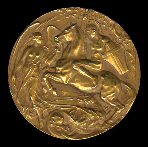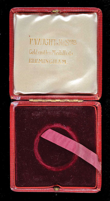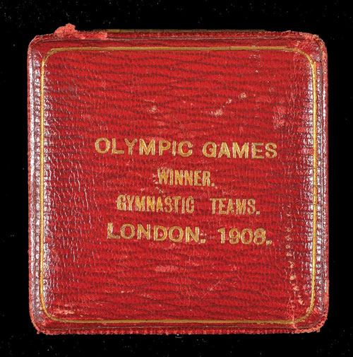 The relief design on the obverse features two female figures placing a laurel crown on the head of a victorious male athlete. The lettering along the base reads "Olympic Games London 1908." The relief design on the reverse portrays the legend of St. George, patron saint of England, who vanquished a dragon to free a princess. The engravings along the perimeter of the medal read "V&S 15-625 Vaughton" and Winner Gymnastic Teams." The medal is complete with its original, hinged presentation box. The gilt-stamped lettering on the box lid reads "Olympic Games/Winner/Gymnastic Teams/London, 1908." The interior features a red-velvet holder for the medal and a white satin-lined lid that is lettered "P. Vaughton & Sons/Goldsmiths & Medalists/Birmingham." The medal (1.25 inches in diameter) remains in Near Mint condition. The box (3 x 3 x .5 inches) displays moderate wear and is in Very Good condition overall. This is an exceedingly rare Olympic gold medal and one of the few surviving examples crafted in solid gold. As such, it represents one of the most significant souvenirs imaginable dating from the dawn of the modern Olympic Games. Weight: 25 grams. Reserve $2,500. Estimate (open).