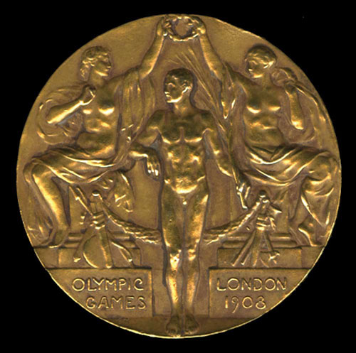 Gold medal, issued to a member of the Swedish Gymnastics Team, for its victory at the 1908 Olympic Games held in London, England. While all Olympic gold medals are significant, the offered medal is particularly noteworthy because it is made of solid gold. Solid gold Olympic medals were only issued for a few of the early modern Olympiads (starting in 1896). Afterwards, beginning in 1920, all Olympic "gold" medals have been made of silver and are simply plated in gold. This is also one of only two 1908 Olympic Gold medals we have ever seen offered at auction, and the first Olympic gold medal we have ever offered. Sweden defeated Norway by a score of 438-425 in the men's team gymnastics to capture the gold medal in 1908. A total of thirty-eight gymnasts made up the Swedish team, each of whom received one of these exquisite medals, which were produced by P. Vaughton & Sons of Birmingham, England.