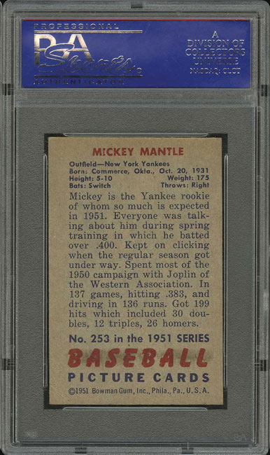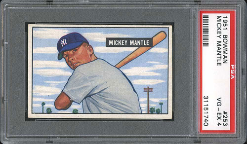 Graded VG-EX 4 by PSA. Outstanding example of Mickey Mantle's true rookie card! One of card collecting's greatest classics, Mantle's Bowman rookie card is the key to the 1951 Bowman set, and one of the most popular and significant of all postwar baseball cards. This striking example has vibrant colors and flawless registration. Centered slightly to the top, with three strong corners and a faint crease in the lower left, which accounts for the modest assigned grade. Clean front and back, with no distracting print lines as are so commonly found with this card. The back is also particularly clean, with just a single wax stain, which are often a problem with 1951 Bowmans. This is a very appealing mid-grade example with an overall appearance stronger than its technically accurate assigned grade. This is also a particularly desirable grade for a Mantle rookie card. In all grades, this card sells for a very respectable sum since Mantle's rookie card is always in great demand; however, the card's value rises exponentially as its grade increases (all the way up to $100,000+ in Mint condition). An extremely attractive example is very difficult to find and arguably represents the best value for this all-time classic Mantle card. Reserve $1,500. Estimate $3,000+.