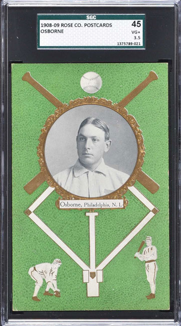 Graded VG+ 45 by SGC (submitted by REA). Outstanding PC760 Rose Postcard example of Fred Osborne of the Philadelphia Phillies. Among advanced collectors, Rose Postcards are regarded as one of the most striking and magnificently designed baseball-card sets ever produced. They are also extremely rare. Crisp image and bold colors, four strong corners showing light touches of wear, and an entirely clean, postally-unused reverse. Downgraded from Excellent due to a very faint surface crease visible only on the reverse. This is an extremely attractive example from one of the era's most classic sets. Reserve $200. Estimate $400+.