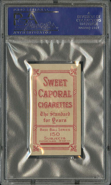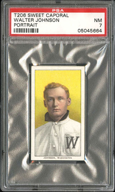 Graded NM 7 by PSA. Exceptionally attractive high-grade example of one of collecting's most classic cards. The T206 Walter Johnson portrait is one of the most famous of all vintage baseball cards. This card is widely recognized to be among Walter Johnson's most striking. In fact, the majestic portrait of Johnson on this card is considered by many advanced collectors to be the single best image of Walter Johnson to appear on any baseball card. This is a beautiful example! It is crisp and clean, with bold colors and a bright yellow background. The corners are square with very light touches of wear. Outstanding centering. The Sweet Caporal Factory 649 advertising on the back is boldly printed. This is a stunning card in an extremely desirable grade, and would be a worthy addition to any T206, Walter Johnson, or classic Hall of Fame card collection. Reserve $2,000. Estimate $4,000+.