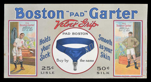 The 1912 Boston Garter set is universally regarded as one of the rarest and most beautiful card issues ever produced. Their great rarity is no doubt in part due to the fact that only one card was issued with each box of twelve garters. 1912 Boston Garters are quite unique in that each features a player in the dugout, without pants, in the midst of getting dressed, proudly displaying his Boston-brand garters. In the background are beautiful stadium scenes, featuring ballplayers warming up.