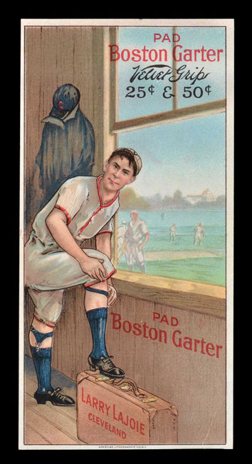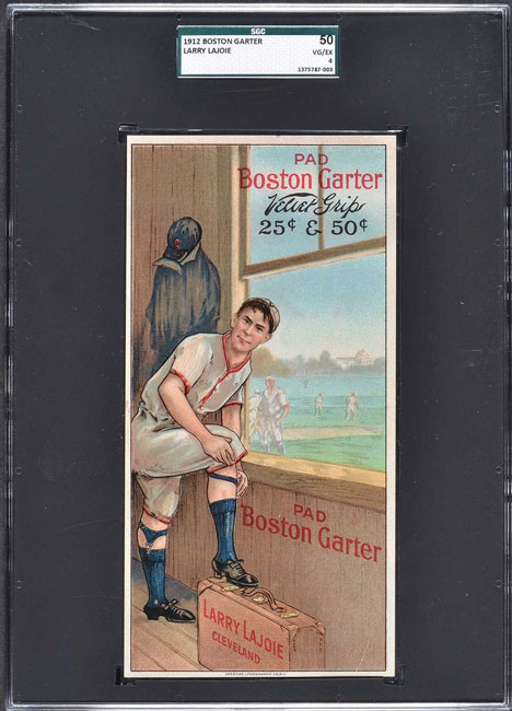 1912 Boston Garters are quite unique in that each features a player in the dugout, without pants, in the midst of getting dressed, proudly displaying their Boston-brand garters. In the background are beautiful stadium scenes, featuring ballplayers warming up. On this magnificent example, Lajoie is resting his foot atop his traveling suitcase near an open window with a baseball field in the distance. It is interesting to note that text advertising "Pad Boston Garter" is alongside Lajoie's image, the first such printing that we ever recall seeing on a 1912 Boston Garter. The unparalleled quality of the lithography and the unique concept of the set both contribute to making 1912 Boston Garters one of the most distinctive and noteworthy baseball card sets ever issued. The large-format card measures 4 x 8.25 inches. The offered example is exceptional in every way, with an Ex-Mt overall display value. It boasts brilliant colors, a crisp image, bright white borders, and four sharp corners. Centered very slightly to the left. A faint one-inch crease in the lower right corner accounts for the assigned grade. The reverse is entirely clean and boldly printed. This is a magnificent card that would be a highlight in even the most advanced card collection in the world and represents an extremely rare opportunity to acquire a Hall of Famer example from the legendary 1912 Boston Garter set. From the Dan Gantt Collection. Reserve $10,000. Estimate (open).