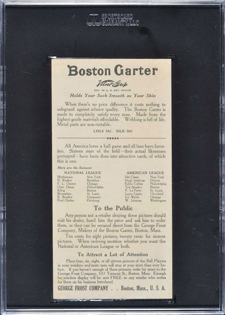 Graded VG/EX 50 by SGC (submitted by REA). Presented is a stunning example of Hall of Famer Napoleon "Larry" Lajoie from the 1912 Boston Garter set, one of the most beautiful card issues ever produced. It is also one of the rarest. In fact, as duly noted in the Standard Catalog, they are so rare that if it were not for the checklist which appears on the back of each card, we would not even know what players comprise the set, let alone that there are sixteen cards to the set (one player is represented from each team). It is a privilege for Robert Edward Auctions to offer one of the key Hall of Famers, Nap Lajoie, from this extraordinary set. This is the only example of Lajoie that we have ever seen in our more than forty years, and several advanced collectors with whom we consulted share our experience. A single scan of this card was shared on the Full Count Vintage Baseball Card Forum in 2008, which was the only confirmation of its existence for many collectors. We estimate that there are fewer than thirty examples of 1912 Boston Garters known to exist in the entire collecting world!