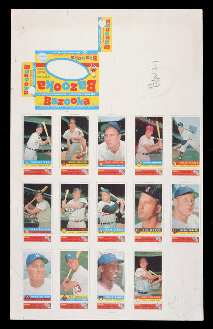 This is one of only three uncut sheets of 1959 Bazooka that we know to exist. One of the other known uncut 1959 Bazooka sheet has dozens of printer notations in ink which relate to the colors of the cards and affect each card on the sheet. Thus, while the other sheet is still a prize, the offered sheet is one of the finer known examples. This sheet was once part of the famed collection of Don Steinbach, one of the hobby's great pioneers, and appeared as lot #272 in a 1997 auction of items from his impressive collection (it has been consigned directly by the buyer at that sale). The sheet is a proof sheet by definition, as opposed to a production sheet, in that it features only the cards, and not the entire boxes as a production sheet would. A 1959 Bazooka box package design is included, also for proofing, in the upper left, adding to the sheet's ideal-for-display design and impressive visual appeal. The sheet is bright and crisp, with magnificent colors. There are pencil-written printer's marks in the margins along with notes in several other spots, including in the lower right underneath the Jensen card. A few minor imperfections are present, including some light surface wear or light creases on several cards. A three-inch tear in the lower left, passing into part of the Snider card, is the only noticeable flaw, but the sheet could be easily matted and framed in an effort to mitigate that and retain an overall Excellent or better display value.
