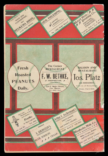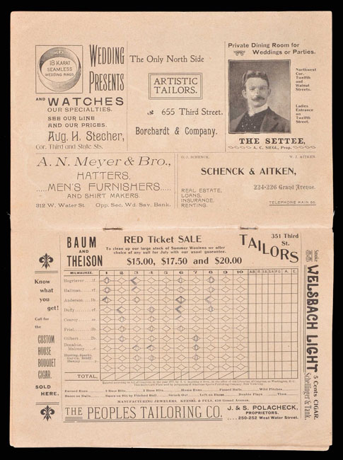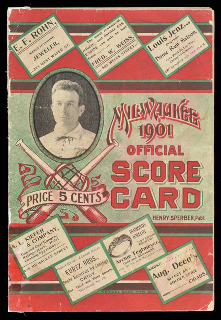 Extremely rare 1901 Milwaukee Brewers program, dating from the American League's inaugural season, issued for a game against the Washington Senators on July 28th. This is the ONLY 1901 Milwaukee Brewers program we have ever seen. The colorful cover features a portrait image of Milwaukee player/manager Hugh Duffy along with advertisements from local merchants. Duffy was one of a number of National League stars who were enticed by higher salaries to jump to the newly formed American League in 1901. As such, he is pictured here in a Boston uniform. Milwaukee was a member of the American League for only the 1901 season. The following year the franchise was replaced by St. Louis, making this both a rare and extremely historically significant regular-season program. The sixteen-page program features a short biography of Duffy, as well as both the current American and National League standings, and Milwaukee's home and away schedules. The preprinted lineups include Waldron, Farrell, and Dungan for Washington, and Duffy, Anderson, and Hallman for Milwaukee. Neatly scored in pencil to record a 1-0 Milwaukee victory in what was the first game of a doubleheader on July 28th. The program (6 x 9 inches) displays a horizontal fold and stray pencil marks on the cover. Both covers have been reattached to the facing page, one by means of rice paper on the front and by tape on the back. Also, the rear cover and one additional page are no longer attached to the spine. It is possible (though we are not sure, as sixteen pages seems like an appropriate number, and we have no other example to compare it with!) that the program is missing a few pages in the front because the first page lists playing rules, but it begins with Rule 29. Technically in modest condition, but retaining much of its display value, and extremely significant as an essentially impossible-to-obtain inaugural American League one-year franchise program, not to mention an important relic relating to professional baseball in Milwaukee. Reserve $500. Estimate $1,000++.