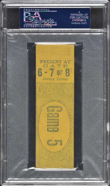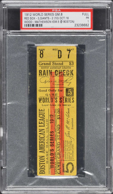 Exceedingly rare full ticket from the 8th and deciding game of the 1912 World Series between the Boston Red Sox and New York Giants held at Fenway Park on October 16th. Graded POOR 1 by PSA. This is one of only three full 1912 Game 8 tickets authenticated by PSA/DNA; two are graded at this level, and NONE are graded higher. Many historians consider the 1912 World Series, which is the only World Series in history to feature a deciding Game 8, one of the most exciting Series ever played. (A few other World Series went 8 games, but they were all best of 9; the 1912 was best of 7, but included one tie.) Four of the games were decided by 1 run, and 2 games went into extra innings. Game 8 was a particularly thrilling affair that matched Giants ace Christy Mathewson against Hugh Bedient. Bedient had defeated Mathewson 2-1 in Game 5, and their rematch was an equally taut affair that remained deadlocked 1-1 after 9 innings. Red Sox ace Joe Wood relieved Bedient in the 8th inning, but he faltered in the 10th, allowing the go-head run on a single by Fred Merkle. With a one-run lead and Mathewson still on the mound for the Giants in the bottom of the 10th, all signs pointed to a Giants victory. Unfortunately, fate had other plans in store for the New York faithful. Aided by a dropped fly ball by Giants centerfielder Fred Snodgrass to start the inning, and another misplayed foul pop up off the bat of Tris Speaker a few batters later, the Red Sox rallied for two runs to capture their first of 4 World Championships during the decade. The ticket (4.75 x 1.5 inches) displays a number of moderate creases, but remains complete as issued. Reserve $5,000. Estimate $10,000+.