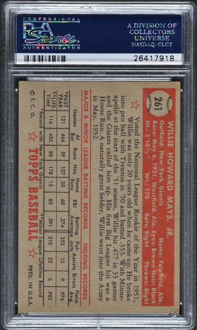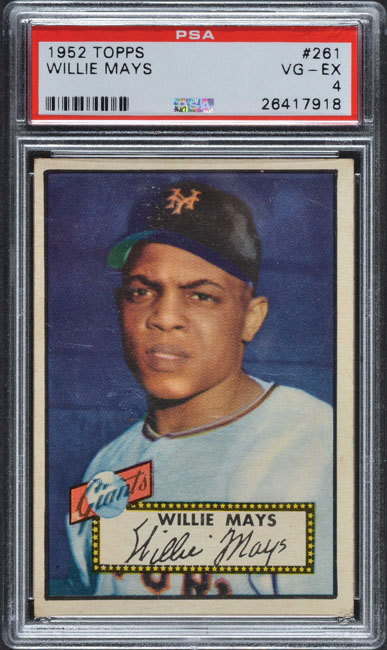 Graded VG-EX 4 by PSA. Very attractive example of one of collecting's most classic cards, the 1952 Topps #261 Willie Mays. The card is bright and clean, both front and back, with perfect image quality, no creasing, and centering a bit toward the upper left. Small corner bends are solely responsible for the conservatively assigned grade. This is a very striking example of one of Willie Mays' most important cards, and one of 1950s bubble-gum card collecting's most famous and universally recognized classics. Reserve $500. Estimate $1,000+.