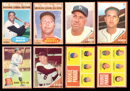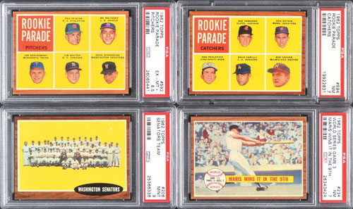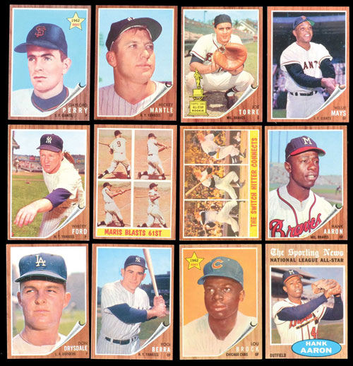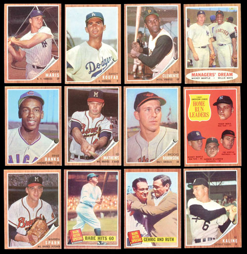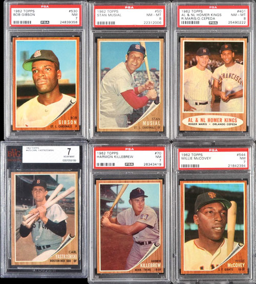 Grades 46% Nr/Mt or better and 54% Ex to Ex-Mt (including ten slightly lesser, twenty-one with a slight trim, a few that measure small, and one with color added). Some of the cards have far better appeal than suggested by their technically accurate assigned grades, but have been downgraded slightly due to light surface impressions from corner mounts. The 1962 Topps set has a well-deserved reputation for being the era's most condition-sensitive issue. The flush-to-the-border wood-grain design of 1962 Topps makes cards from this set particularly susceptible to wear. This particular set also includes eight variations (two variations for #139 and both variations for #129, 134, 147, 174, 176, and 190), plus fifty-seven of the seventy-seven green tint photo variations from the second series (#110-196), for a total of 663 cards. Eleven cards have been graded and encapsulated by PSA (except for one BVG as noted). Keys: #1 Maris (Ex+), 5 Koufax (measures small, 20/80 L/R, otherwise Ex+), 10 Clemente (slight trim, otherwise Ex-Mt+), 18 Mantle/Mays (Ex), 25 Banks (Nr/Mt+), 30 Mathews (Nr/Mt), 45 Robinson (Ex+), 50 Musial (NM-MT 8), 53 Maris/Mantle LL (30/70 L/R, otherwise Nr/Mt), 70 Killebrew (NM 7), 100 Spahn (Ex-Mt), 139b Reniff (possible slight trim, otherwise Vg-Ex+), 139c Babe Hits 60 (measures small, otherwise Ex), 139d Babe Hits 60 (20/80 T/B, otherwise Nr/Mt), 140 Ruth/Gehrig (Ex-Mt+), 150 Kaline (green tint, slight trim, otherwise Nr/Mt), 150 Kaline (25/75 L/R, otherwise Ex-Mt), 199 Perry RC (slight trim, otherwise Nr/Mt), 200 Mantle (slight trim, two tiny spots of paper loss on front, otherwise Nr/Mt), 206 Senators (MINT 9), 218 Torre (Ex+), 234 W.S. Game 3 - Maris (NM 7), 300 Mays (Nr/Mt+), 310 Ford (Ex-Mt), 313 Maris IA (slight trim, otherwise Ex-Mt), 318 Mantle IA (slight trim, otherwise Ex-Mt), 320 Aaron (slight trim, otherwise Nr/Mt), 340 Drysdale (Nr/Mt), 350 F. Robinson (EX+ 5.5), 360 Berra (Ex), 387 Brock RC (Ex), 394 Aaron AS (slight trim, otherwise Nr/Mt), 395 Mays AS (measures small, otherwise Nr/Mt-Mt), 401 Maris/Cepeda (NM-MT 8), 425 Yastrzemski (BVG NM 7), 461 Hubbs RC (slight trim, otherwise Nr/Mt-Mt), 471 Mantle AS (slight trim, otherwise Nr/Mt+), 500 Snider (Vg-Ex), 530 Gibson SP (NM 7), 544 McCovey SP (NM 7), 545 Wilhelm SP (Ex+), 575 Schoendienst SP (Ex-Mt), 592 Bouton (EX-MT+ 6.5), 594 Uecker (NM 7), 596 Pepitone (slight trim, otherwise Ex-Mt), and 598 Hickman (slight trim, otherwise Nr/Mt). This is an extremely impressive 1962 Topps set, far superior to the average set of this very condition-sensitive issue. The SMR value for just the eleven graded cards (not including the additional 652 cards in the set!) is $1,205. Total: 663 cards (set of 598 plus 65 variations). Reserve $500. Estimate $1,000/$2,000+.
