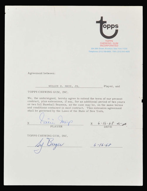 1968 Topps extension agreement signed by both Willie Mays and Topps executive Sy Berger, “The Father of the Bubble-Gum Card.” The one-page agreement, dated 6/16/68 and typed on Topps letterhead, extends Mays’ current baseball-card contract with the company for another two seasons. Signed by “Willie Mays” and “Sy Berger” in blue ink, with both signatures grading “10.” The agreement (8.5 x 11 inches) displays two horizontal folds, a few small edge tears, a staple hole, and a paperclip impression at the top. In Very Good to Excellent condition overall. Full LOA from PSA/DNA and auction LOA from James Spence/JSA. Pre certified by Steve Grad and Brian Sobrero/Beckett Authentication.