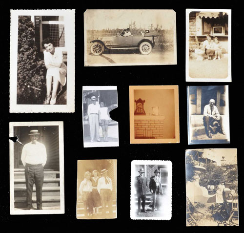 Collection of fourteen original Joe Jackson family snapshot photos, all of which originate from Jackson's estate. Ideally, ten of the fourteen photos include Jackson. (Four capture the legendary ballplayer posing alone, while the other six picture him with either family members or friends.) Since these photos were taken long after Jackson's playing career, none are baseball related. Instead they capture Jackson either at work or leisure during the last decade of his life. Photos range in size from 2 x 3.5 inches to 5 x 7 inches, with the size distribution fairly equal (half are in the smaller range, half in the larger range). A few of the photos are trimmed to their current dimensions and three have paper residue on the reverse from having been removed from an album. One photo is mounted on cardboard and another displays a moderate tear (paper loss). In Excellent condition overall. Total: 14 photos.