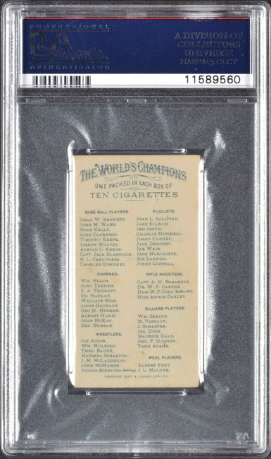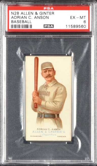 Graded EX-MT 6 by PSA. Outstanding high-grade example of Cap Anson, the key card from the popular N28 Allen & Ginter "World's Champions" series. N28 Allen & Ginter "World's Champions" are considered by many to be the most beautiful of all nineteenth-century tobacco-card issues. It is rare to find any nineteenth-century card in such high grade, let alone one of the era's most classic cards of such a prominent Hall of Famer. The card is crisp and clean, with four strong corners, rich colors, and perfect registration. Crisp and clean checklist reverse. A spectacular high-grade example of one of the most classic of all nineteenth-century baseball cards. Reserve $1,500. Estimate $3,000+.