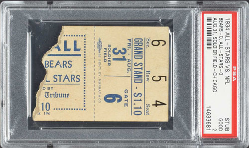 Ticket stub issued for the first-ever Chicago Charities College All-Star Game held at Soldier Field in Chicago on August 31, 1934. Graded GOOD 2 by PSA. This is one of only 3 examples evaluated by PSA and the only one graded at this level (both of the other examples are graded VG-EX 4, but have qualifiers). The Chicago Charities College All-Star Game was the brainchild of Arch Ward, sports editor of the Chicago Tribune. One year earlier Ward had come up with the idea of the Major League All-Star Game and this football game was a natural extension. The annual game matched the defending NFL champions vs. an all-star team of college seniors from the previous season, with the proceeds going to Chicago-area charities. The first game in 1934, between the Bears and college all stars ended in a 0-0 tie. The game continued for decades before ending in 1976. 3 x 2 inches. Reserve $200. Estimate $400+.