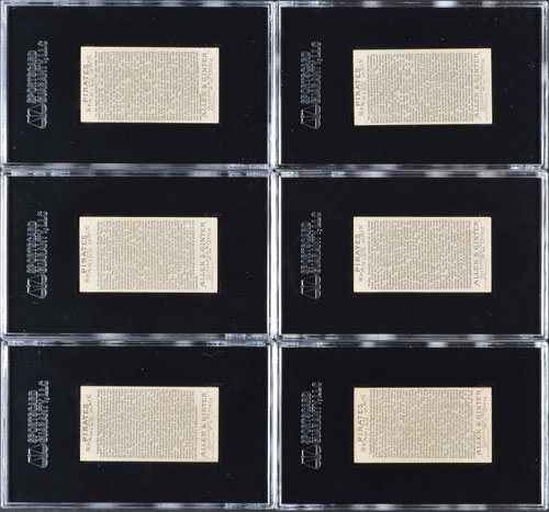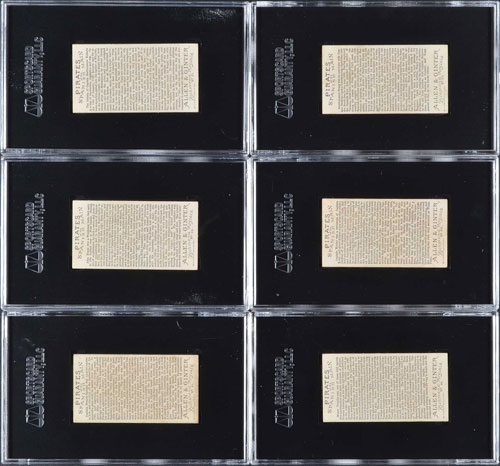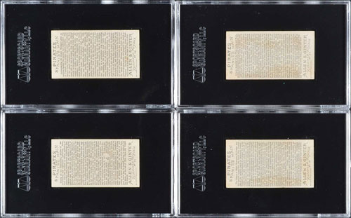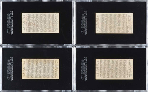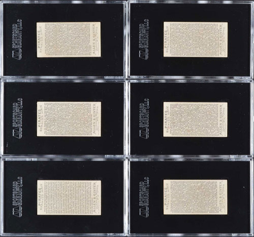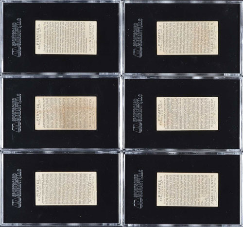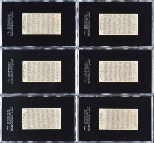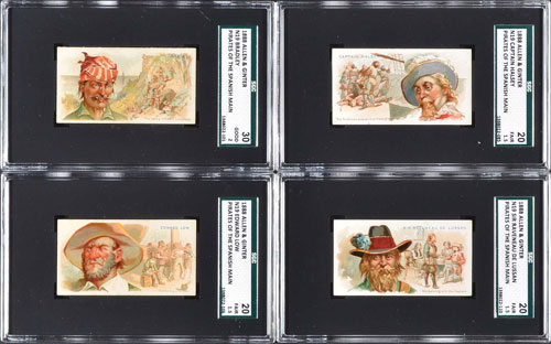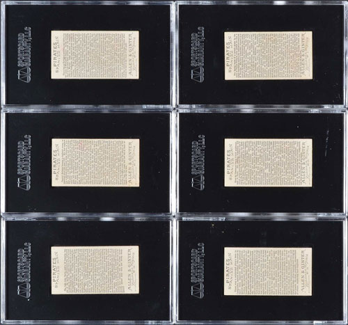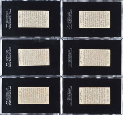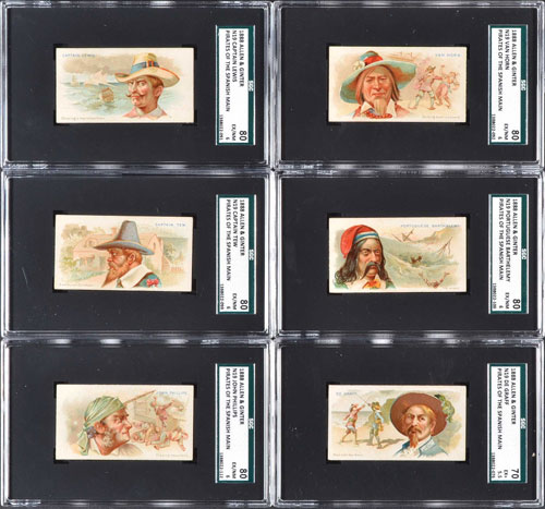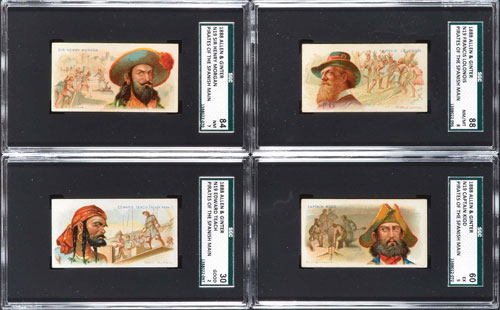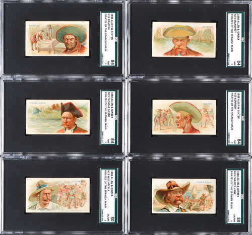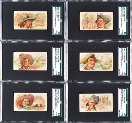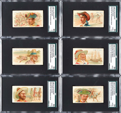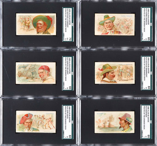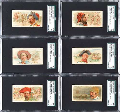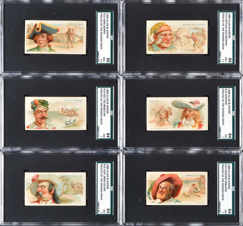 Complete set of fifty 1888 N19 Allen & Ginter "Pirates of Spanish Main" cards, all graded and encapsulated by SGC (submitted by REA). Presented is a very attractive high-grade complete set of these extremely popular and colorful tobacco cards, with twelve cards ranging from Nr/Mt to Nr/Mt-Mt, twenty-eight ranging from Ex to Ex-Mt, one is Vg-Ex+, three are Vg-Ex, and six lesser (Fr-Gd+). In the following condition composite, cards are identified by the numbers provided by the American Tobacco Cards Price Guide checklist. The complete SGC condition composite follows: NM/MT 88 (1 card): #33 Lolonois. NM+ 86 (2 cards): #32 and 42. NM 84 (9 cards): #7 Sir Henry Morgan, 11, 12, 27, 31, 39, 41, 44, and 46. EX/NM 80 (13 cards): #3, 4, 5, 6, 17, 18, 24, 25, 28, 29, 36, 37, and 49 Phillips. EX+ 70 (2 cards): #13 and 14. EX 60 (13 cards): #1, 2, 9 Captain Kidd, 15, 16, 19, 21, 23, 26, 30, 45, 48 Vauclin, and 50. VG/EX+ 55 (1 card): #35 Read. VG/EX 50 (3 cards): #8, 10, and 40. GOOD+ 35 (1 card): #20 Condent. GOOD 30 (2 cards): #34 Edward "Blackbeard" Teach and 38. FAIR 20 (3 cards): #22, 43, and 47. Issued with Allen & Ginter Cigarettes, the set is entitled "Pirates of Spanish Main." Each card features a portrait image of a legendary pirate (such as Blackbeard, Captain Kidd, Sir Henry Morgan, etc.) on the front with a beautiful color lithograph of a scene relating to the individual's field of interest. The back of each card features the biography for the pirate. This is an extremely attractive set, with fascinating subject matter, and with outstanding eye-appeal. This set is from the collection of a very advanced longtime nonsport collector. Allen & Ginter's "Pirates of Spanish Main" are rarely offered as a complete set (in fact this is only the third complete set we have ever sold in the last thirteen years), and are highly prized by historical collectors and nineteenth-century nonsport tobacco-card collectors. Total: 50 cards. Reserve $1,000. Estimate $2,500++.