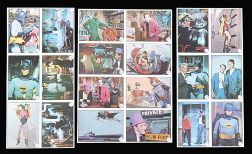 Presented is a complete 55-card set from the 1966 Topps “Batman – Bat Laffs” series, presented on eight uncut panels, and each of which has a large, colorful picture (complete puzzle) on the reverse featuring one of the major characters from the popular television show including Batman, Robin, Bruce Wayne, Joker, Riddler, Penguin, the dynamic duo, and the Police Commissioner. Batman took the world by storm in 1966 with the introduction of the wildly popular Batman television series. Topps joined the bandwagon with several series of card sets devoted to the Caped Crusader. This classic 55-card set features crisp, photographic images of various scenes directly from the television series starring Adam West as Batman. The reverse of each card contains a small puzzle as well as the bat-themed joke series entitled "Bat Laffs." The panels consist of six to nine cards each and have an overall Excellent appearance with very light surface creases or wrinkles. This is an outstanding opportunity to acquire all fifty-five cards at one time in fascinating and extremely rare uncut panel form. Total: 8 uncut panels.