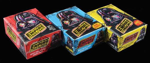 Collection of three complete unopened wax boxes of 1980 Topps "Star Wars: The Empire Strikes Back" Series 1, 2, and 3 nonsport cards. Each box contains thirty-six packs for a total of 108 packs in this collection. These boxes come shrink-wrapped by Baseball Card Exchange (owned by Steve Hart, the foremost expert on unopened material). While it is impossible to provide guarantees with reference to grading of unopened material, there is, of course, the very real possibility that within this box are Mint or Gem Mint examples from this extremely popular set. The boxes are in exceptional condition, appearing almost exactly as they did on store shelves nearly forty years ago! A worthy addition to any collection of "Star Wars" or unopened material. Total: 3 boxes. Reserve $300. Estimate (open).