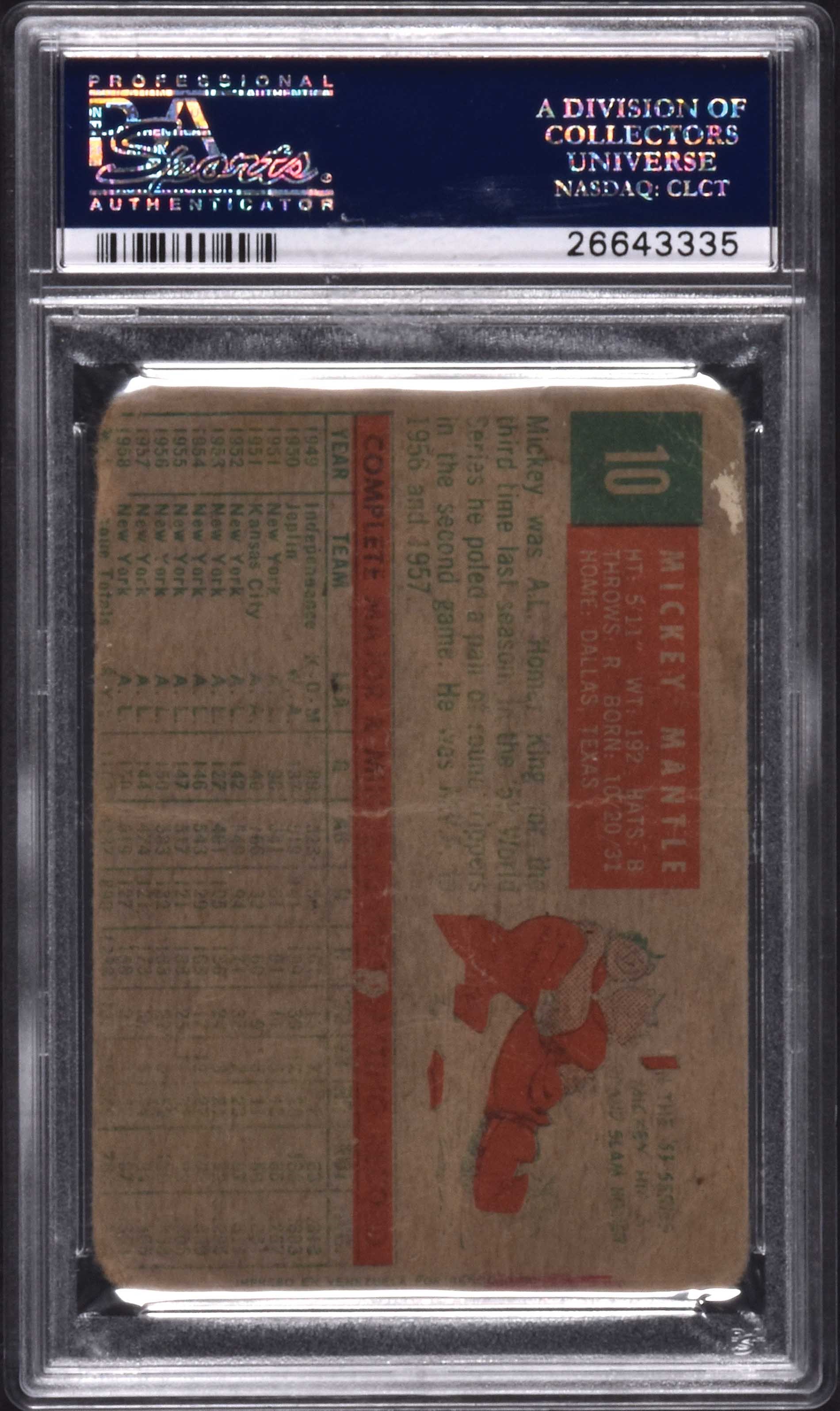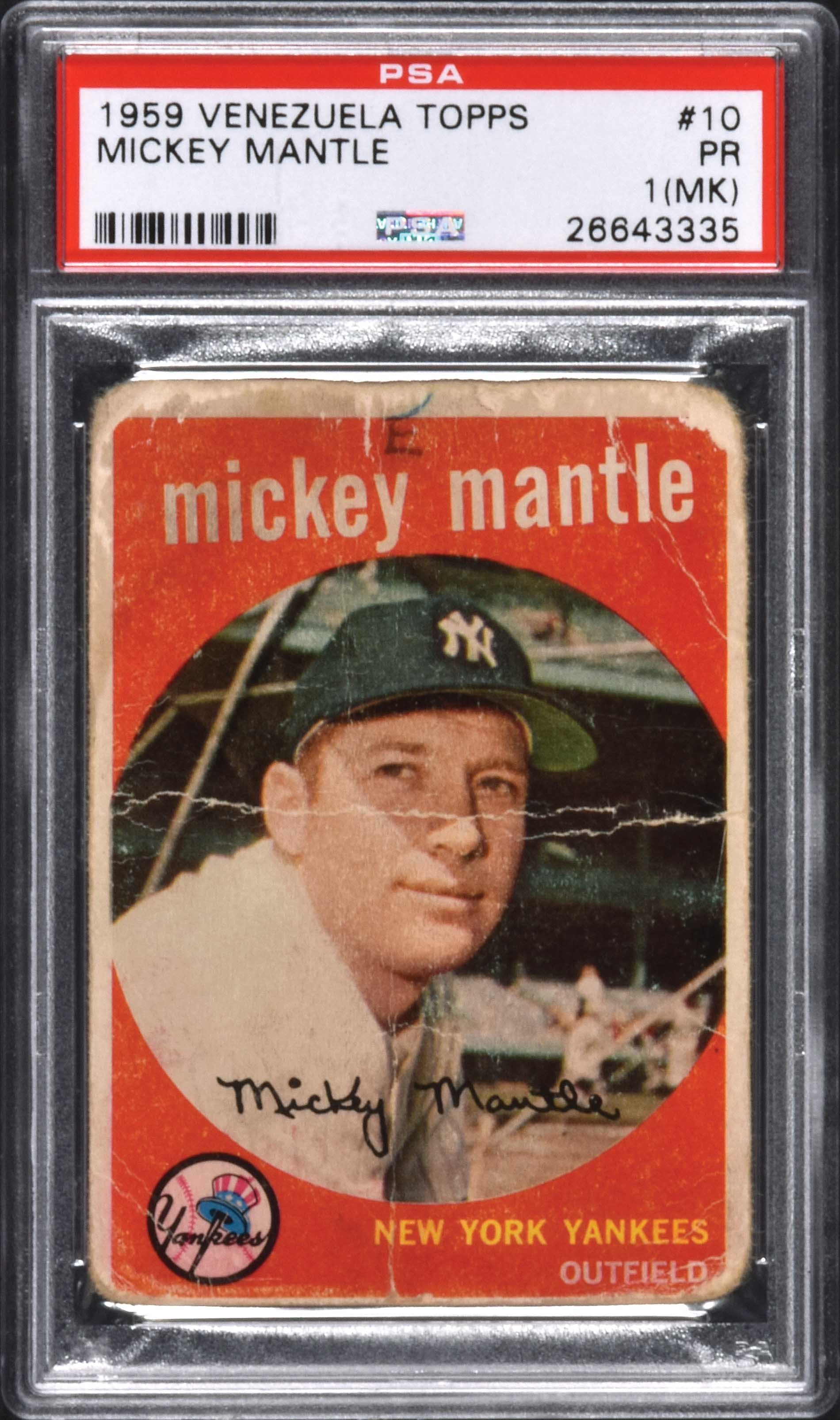 Rarely offered example of New York Yankees Hall of Famer Mickey Mantle, the key card to the 1959 Topps Venezuelan set. The Topps Venezuelan issues are among the most fascinating sets of the late 1950s and 1960s. The first 196 cards of Topps’ 1959 baseball set were reprinted on a non-glossy cardboard stock for sale exclusively in the Venezuelan market. The fronts are identical in design to the regular-issue Topps’ cards, but the backs are darker than normal and the credit line “Impreso En Venezuela Por Benco C.A." is printed along the bottom edge. Graded PR 1 (MK) by PSA, the obvious condition flaws include multiple creases, severely rounded corners, and the letter “E” written in blue ink at the top. The reverse of the card is heavily worn. Though they receive little attention because they are virtually never found in high grade, Topps Venezuelan cards are among the most unusual and rare baseball-card sets of the decade. This is a very presentable Venezuelan example of one of the key cards of the decade, and a rarity that would be a significant addition to any Topps Venezuelan, type-card, or Mickey Mantle collection. Reserve $300. Estimate (open).