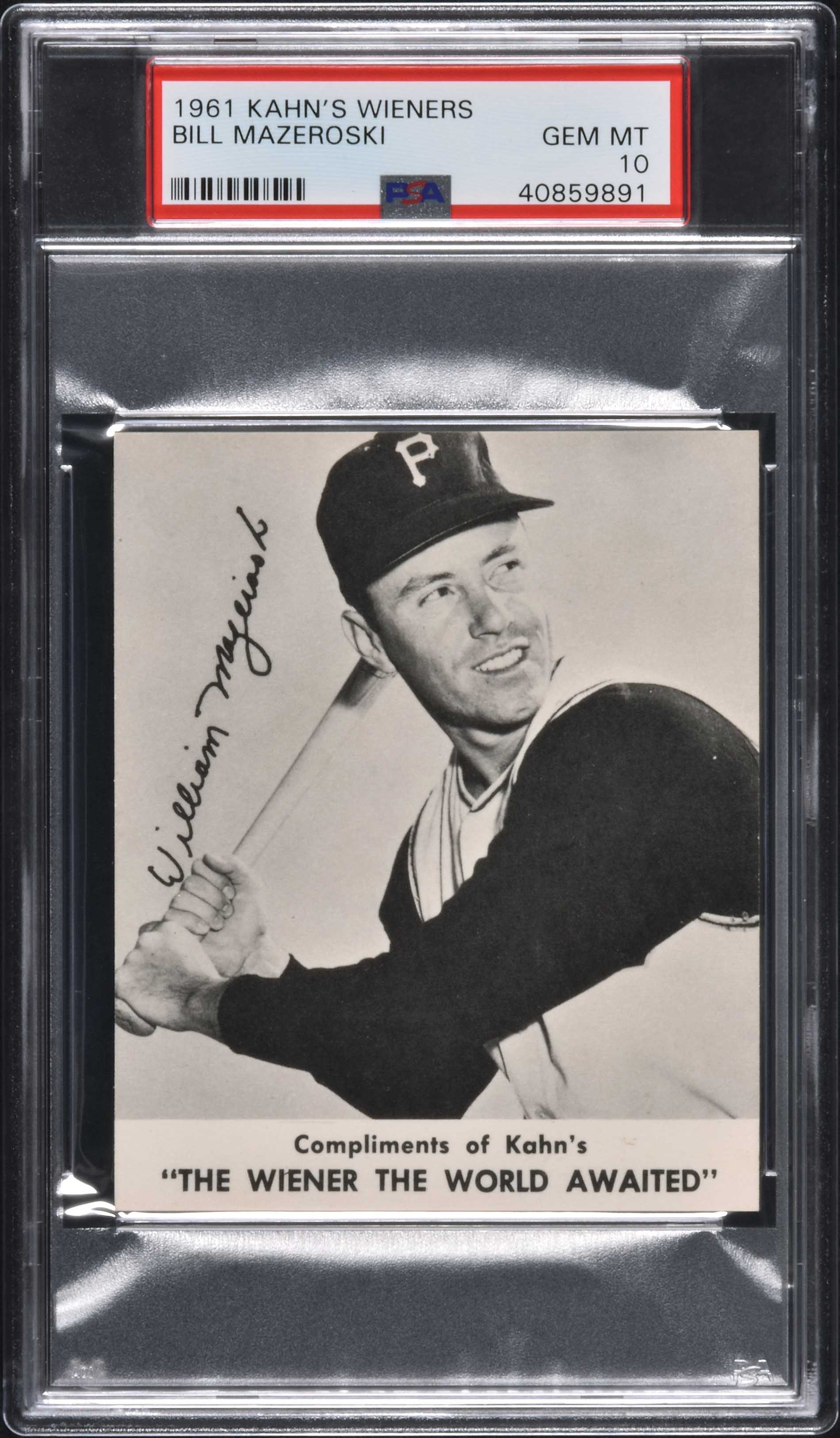 Graded GEM MINT 10 by PSA (submitted by REA). This is the ONLY example graded at this level by PSA! Superb ultra high-grade example of Hall of Famer Bill Mazeroski (Pittsburgh Pirates) from the 1961 Kahn's Wieners set. Kahn's Wieners cards are one of the few food issues of the era and are far rarer than most other baseball cards issued around the same time period. This distinctive and very scarce 1960s regional issue features players from the Reds, Pirates, and Indians. This is an extraordinary example! Crisp and clean, with a flawless image and four razor-sharp corners. Clean reverse. This outstanding ultra high-grade example would be a worthy addition to any world-class 1961 Kahn's Wieners set or Pittsburgh Pirates collection. Reserve $500. Estimate (open).