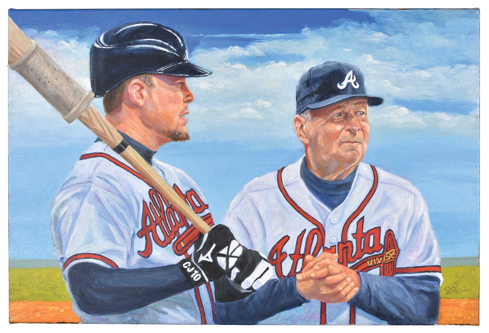 Original oil on canvas artwork (30 x 20 inches) of Bobby Cox and Chipper Jones by noted baseball artist Dick Perez. Signed by the artist in the lower right corner. Mint condition. Titled "Chipper Joins Skipper", the painting captures the two most recent Atlanta Braves inducted into the Baseball Hall of Fame. This is a recent work by Perez and one that he plans to feature in a separate, updated edition of his now classic 2010 book titled The Immortals: An Art Collection of Baseball's Best. (The updated edition, which does not yet have a publication date, will showcase all of the Hall of Fame inductees from 2011 to 2020.) This particular painting is intended for the portion of the book dedicated to Bobby Cox. One of the most successful managers in baseball history, Cox will forever be remembered for his tenure with the Braves from 1990-2010, when the club won five pennants and one World Championship. Cox also guided the club to 15 postseason appearances during that span. Today, he ranks fourth on the all-time list for wins as a manager. In 2011 the Atlanta Braves retired his number "6," and three years later he was inducted into the Baseball Hall of Fame.