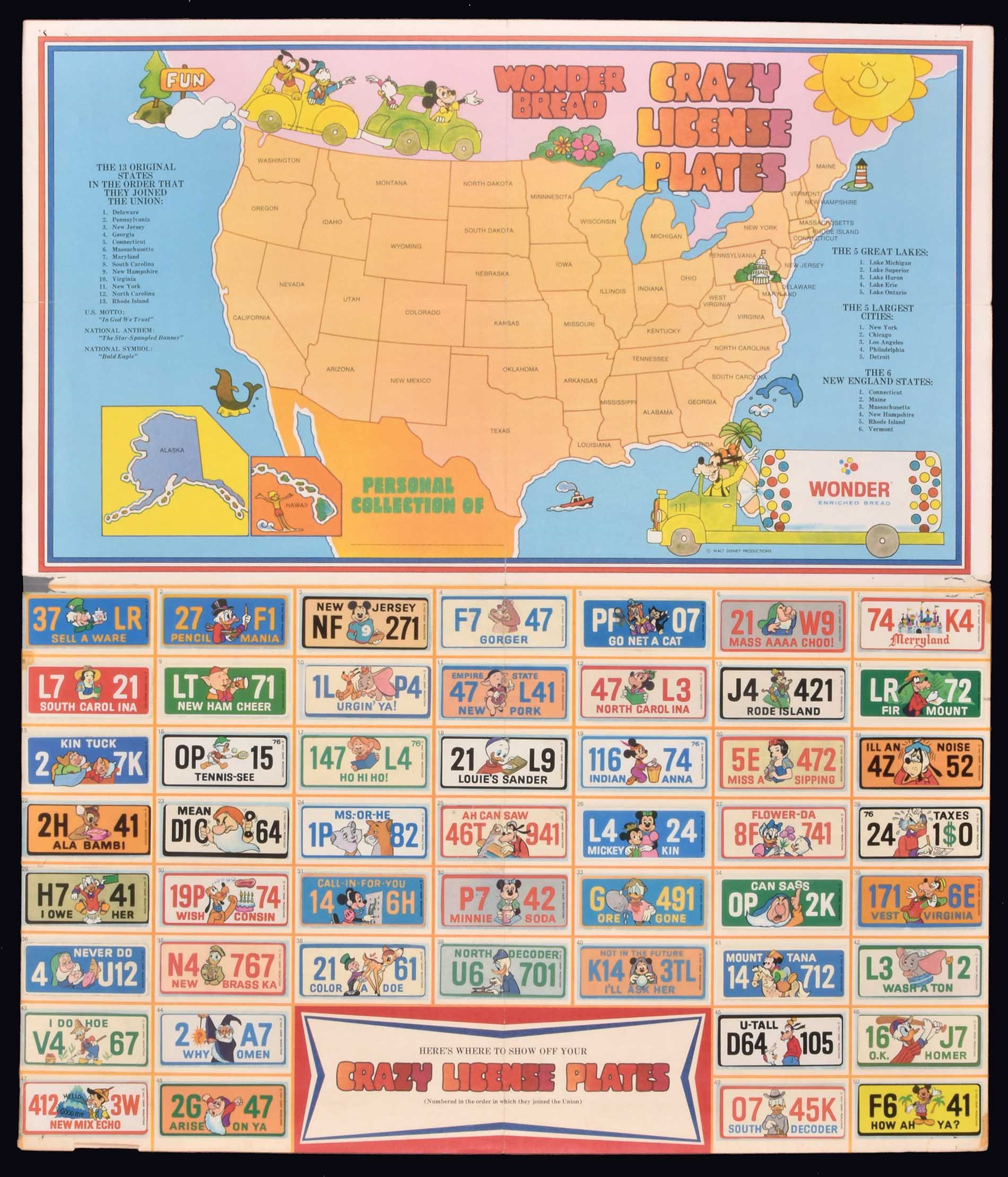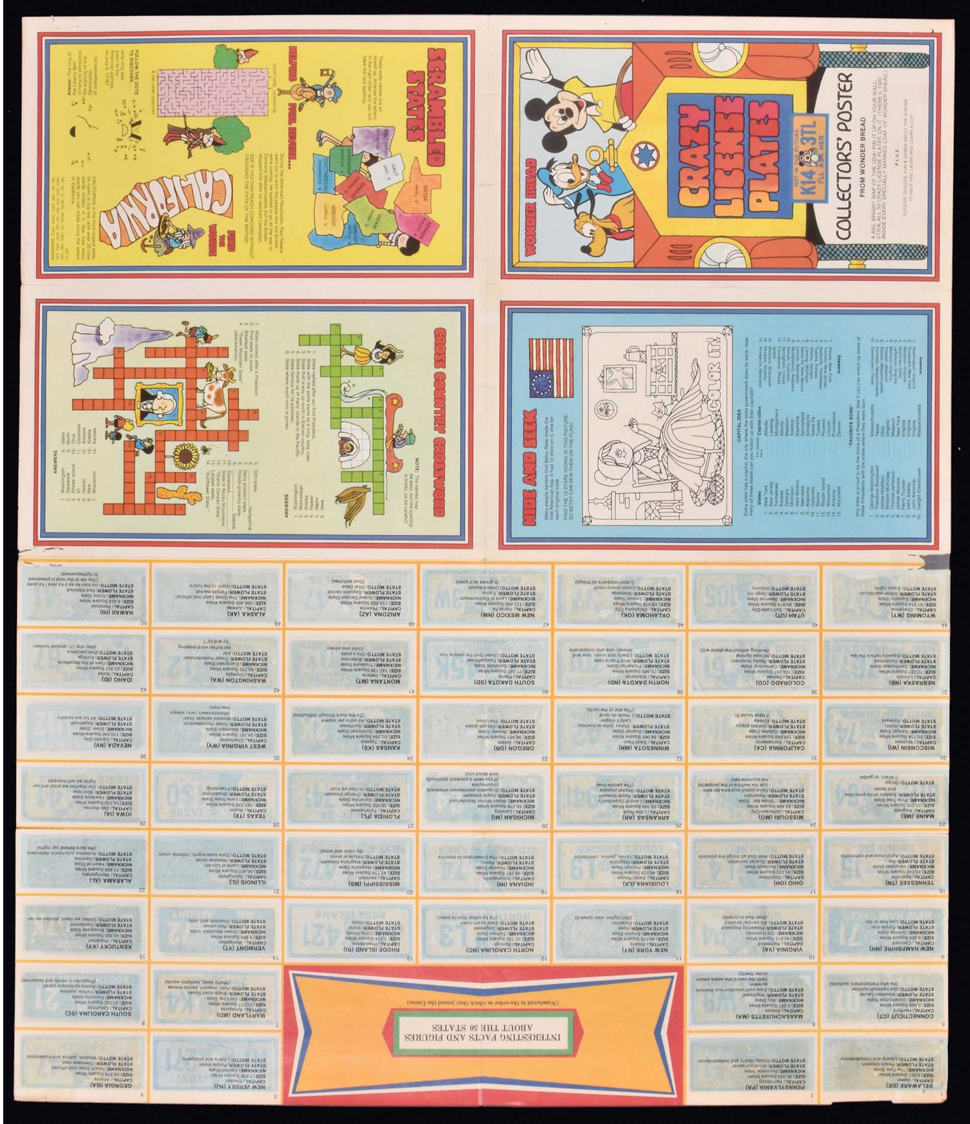 Offered is a fascinating collection of five items all related to popular Disney characters issued by Topps and Wonder Bread in the 1960s and 1970s. The collection consists of the following: 1) 1963 Topps "Walt Disney Characters Tattoo" One-Cent Display Box. Entirely folded down, the box measures approximately 12.75 x 14.75 inches and is in overall Fair condition. COA from Topps Vault. 2) 1963 Topps "Walt Disney Characters Tattoo" Proof Wrapper. The uncut sheet (11 x 15 inches) features sixteen wrappers (four different variations) and is in overall Very Good condition. COA from Topps Vault. 3) 1963 Topps "Walt Disney Characters Tattoo" Unopened Pack. The wrapper features Donald Duck. Excellent condition. 4) 1975 Wonder Bread "Crazy College Pennant Stickers" Collector Poster. This poster (22 x 17 inches) features the complete set of all twenty-five pennant stickers affixed to their assigned area on the poster. Fair condition. 5) 1976 Wonder Bread "Crazy License Plates Stickers" Collector Poster. This poster (22 x 25.75 inches) features the complete set of all fifty-five stickers affixed to their assigned area on the poster. Fair condition. Total: 5 items.