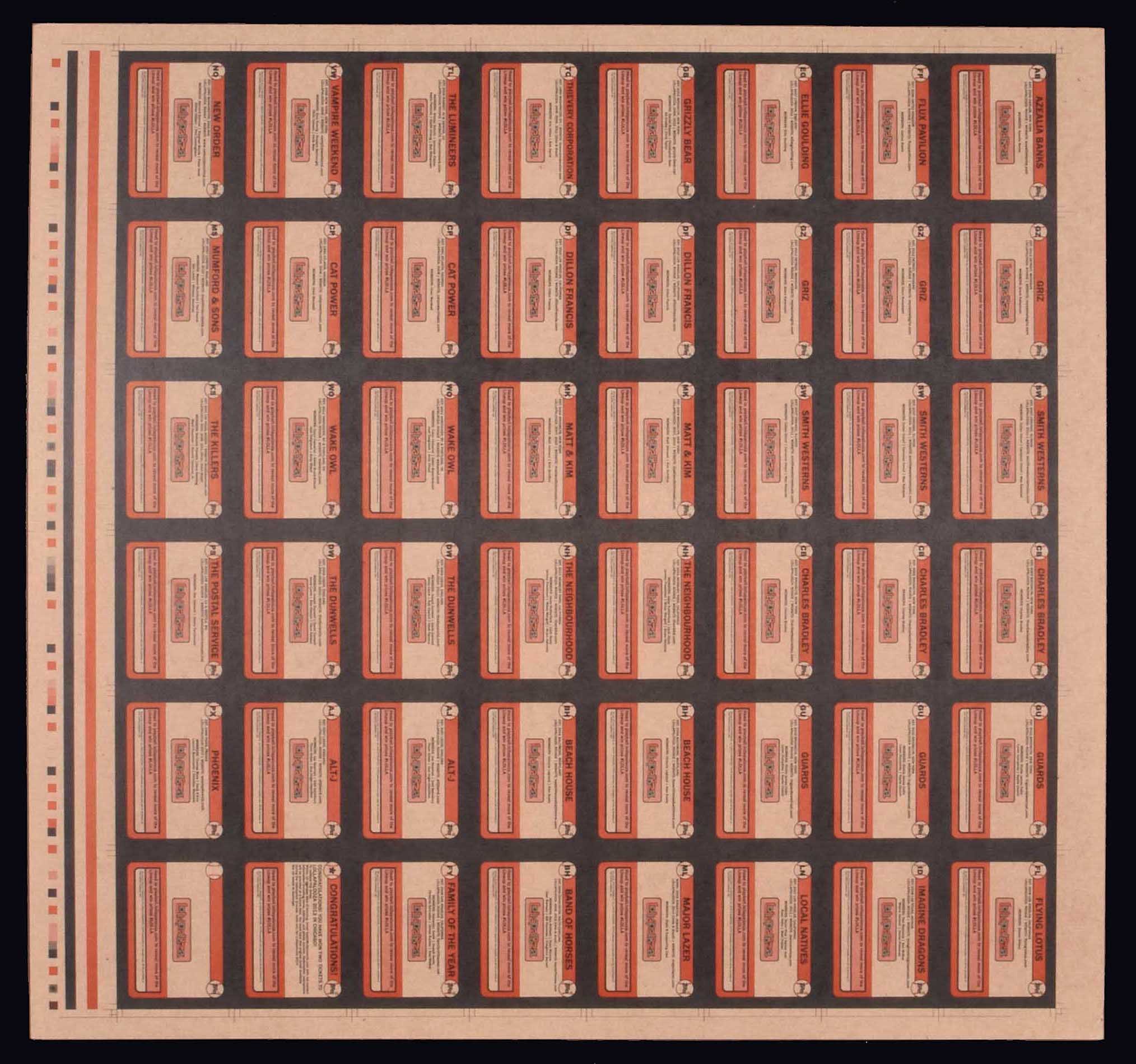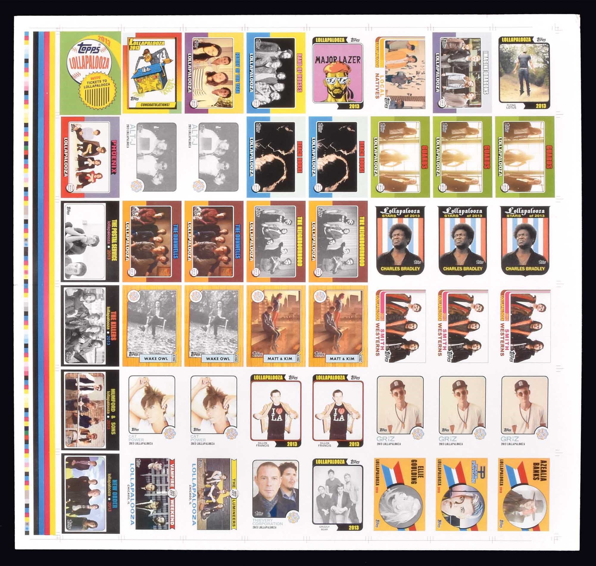 Topps and Lollapalooza partnered for a set of trading cards intended to promote the 2013 Lollapalooza festival at Chicago's Grant Park. The promotional set had 29 cards, an Instant Win prize card (which was good for three-day passes to the festival), and a Wrapper/Header card. Highlights include: The Killers, Imagine Dragons, Ellie Goudling, Mumford & Sons, and New Order. The offered forty-eight card uncut sheet features a complete set plus duplicates and triplicates of twelve of the cards. Also included on the sheet in the style of the 1974 Topps Baseball design is an unreleased card of the artist Flying Lotus for which we were not able to find any available information. In a very limited release, the Topps Lollapalooza trading cards were given out in wax packs at Wrigleyville outside of Wrigley Field during the Cubs' home opener on April 8. 2013. Designs mimic past Topps baseball card sets (1959, 1960, 1971, 1973-1975, 1979, 1982, 1987, and 1990), giving them the feel of a Topps Archives set. For nearly all of the performers and bands included, this was very likely their first appearance on a trading card. Twenty-nine of the performers and bands scheduled for the festival that ran from August 2-4, 2013 were included in the set. The forty-eight card sheet consists of the following: two Alt-J, Band of Horses, Azealia Banks, two Beach House, three Charles Bradley, two Cat Power, Family of the Year, two Dillon Francis, two The Dunwells, Ellie Goudling, Flux Pavillion, three GRiZ., Grizzly Bear, three Guards, Imagine Dragons, The Killers, Local Natives, The Lumineers, Major Lazer, two Matt & Kim, Mumford & Sons, two The Neighbourhood, New Order, Phoenix, The Postal Service, three Smith Westerns, Thievery Corporation, Vampire Weekend, and two Wake Owl. Also on the sheet are one each of the Instant Win prize card and Wrapper/Header card, and an unreleased card of Flying Lotus. The sheet displays a bend on the upper right corner (likely from storage), otherwise it appears Near Mint. While the set of single cards is very difficult to piece together based upon the method of release, this is an opportunity to add a complete set in uncut sheet form to an advanced music memorabilia collection, or simply as a striking piece to frame and display. Dimensions: 24 x 25 inches. Reserve $200. Estimate (open).