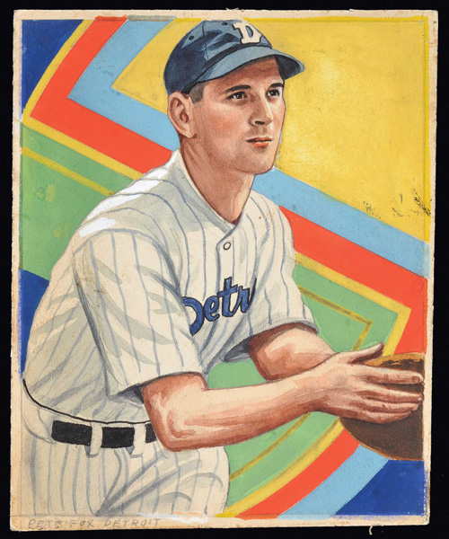Original unissued artwork featuring Pete Fox of the Detroit Tigers to be used in the 1935 R327 Diamond Stars series. This artwork of Fox was created (but never used) by National Chicle to be included in its Diamond Stars series. The Diamond Stars set is highly prized by collectors in large part because of the beautiful artwork and art deco-inspired designs of the set. The detail and the geometric background designs of the offered example are exceptional. Artwork for card sets from the 1930s are exceedingly rare. Back in the late 1970’s a group of material surfaced in the collecting world directly from the family of a National Chicle employee, which included approximately thirty original R327 Diamond Star artworks, approximately twenty-five National Chicle Football artworks, and approximately one-hundred additional artworks from several National Chicle nonsport sets (including R136 Sky Birds). The offered artwork originates directly from this historic find, and is an exceptional example of original 1930s gum card artworks. As is the case with all Diamond Stars artworks, the artwork is on thick artist’s board, and measures 4.5 x 5.5 inches. Extremely clean, with sharp, bright, crisp colors. In Excellent to Mint condition. Reserve $500. Estimate (open).