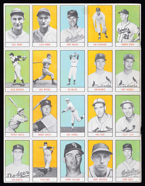 Summer 1959 issue of Oklahoma Today featuring an uncut set of 20 mini baseball cards on the back cover, including Mickey Mantle. This 36-page publication, dedicated to life in the "Sooner State," features an article dedicated to Oklahoma natives who played Major League baseball. In accordance with that article, the magazine also produced a set of mini cards on the back cover picturing 20 of those individuals, including Hall of Famers Mickey Mantle, Carl Hubbell, Dizzy Dean, Paul Waner, Lloyd Waner, and Warren Spahn. Each card (1.75 x 2.75 inches) pictures the player in uniform (either full figure or bust-length image), while the reverse simply lists the player's name, position, main team affiliation, and respective league. Each of the cards was meant to be cut out by hand, with printed perforation lines to be used as a guide. The Mantle card appears to have a tiny blue ink mark above his right ear; otherwise it is in overall Excellent condition. The magazine (8.5 x 11 inches) is in Very Good condition overall, with an erased pencil mark on the cover and a few light creases to both covers.