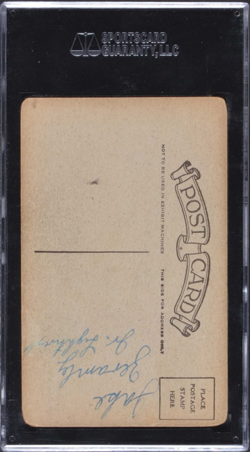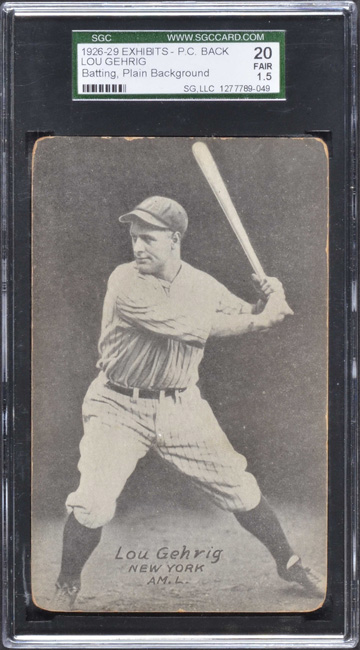 Graded FAIR 20 by SGC. Rarely offered example of New York Yankees Hall of Famer Lou Gehrig from the 1926-1929 postcard-back Exhibit-style set. Gehrig is depicted in an ideal batting pose (identical to the image used on the 1933 Goudey set). A small competitor of the Exhibit Supply Company actually issued this classic Exhibit-style card. The cards were issued two ways: with or without normal postcard indicia on the reverse. The offered example is the "postcard-format" variety. The postcard-format reverse includes the warning: “Not To be Used In Exhibit Machines.” The card is crisp and clean with no wrinkles or creases and evenly rounded corners. The blank postcard back displays light natural toning and blue ink notations, which accounts for the modest assigned grade. This a very attractive example, offering an outstanding value compared to many other cards from Gehrig's playing days. Reserve $300. Estimate (open).