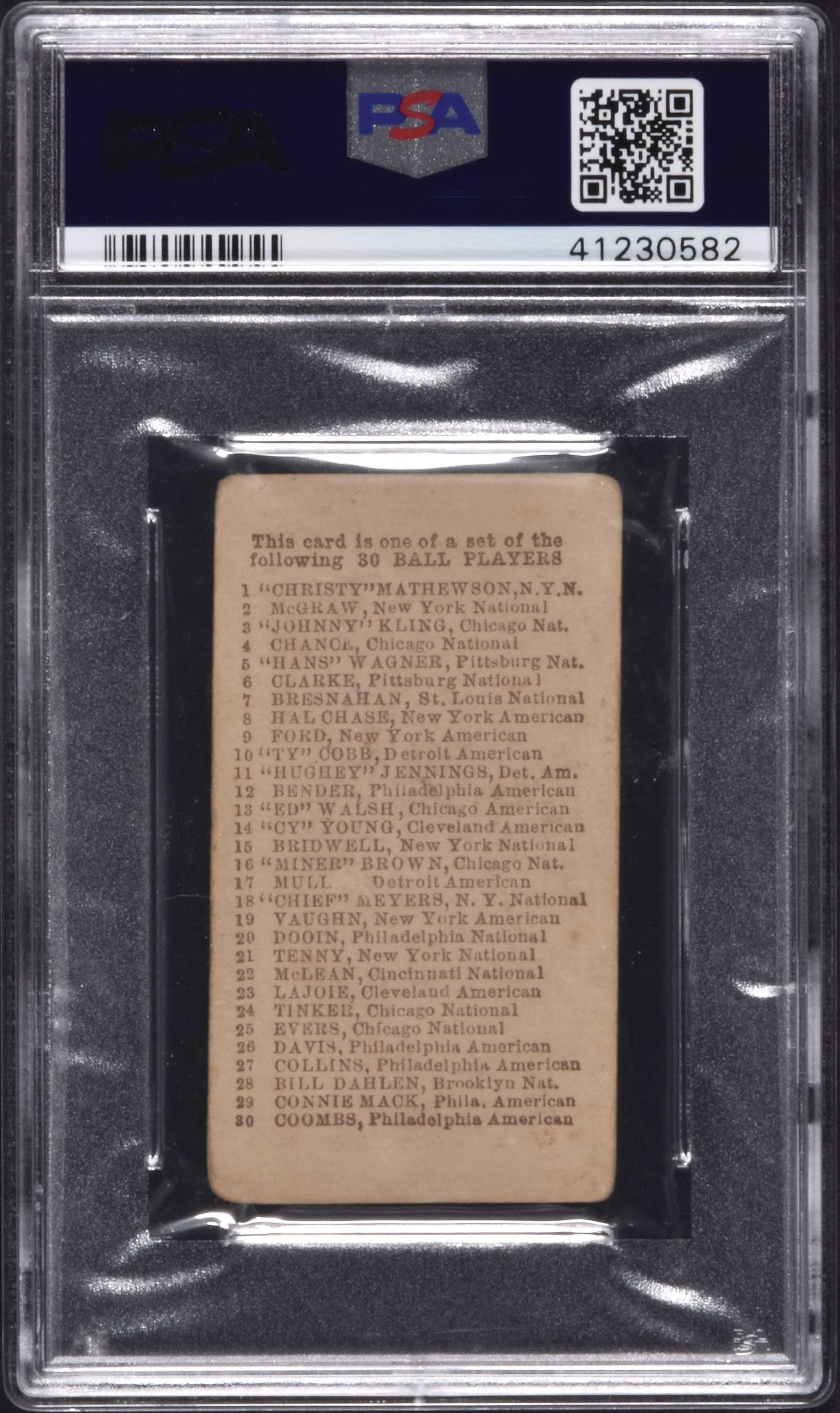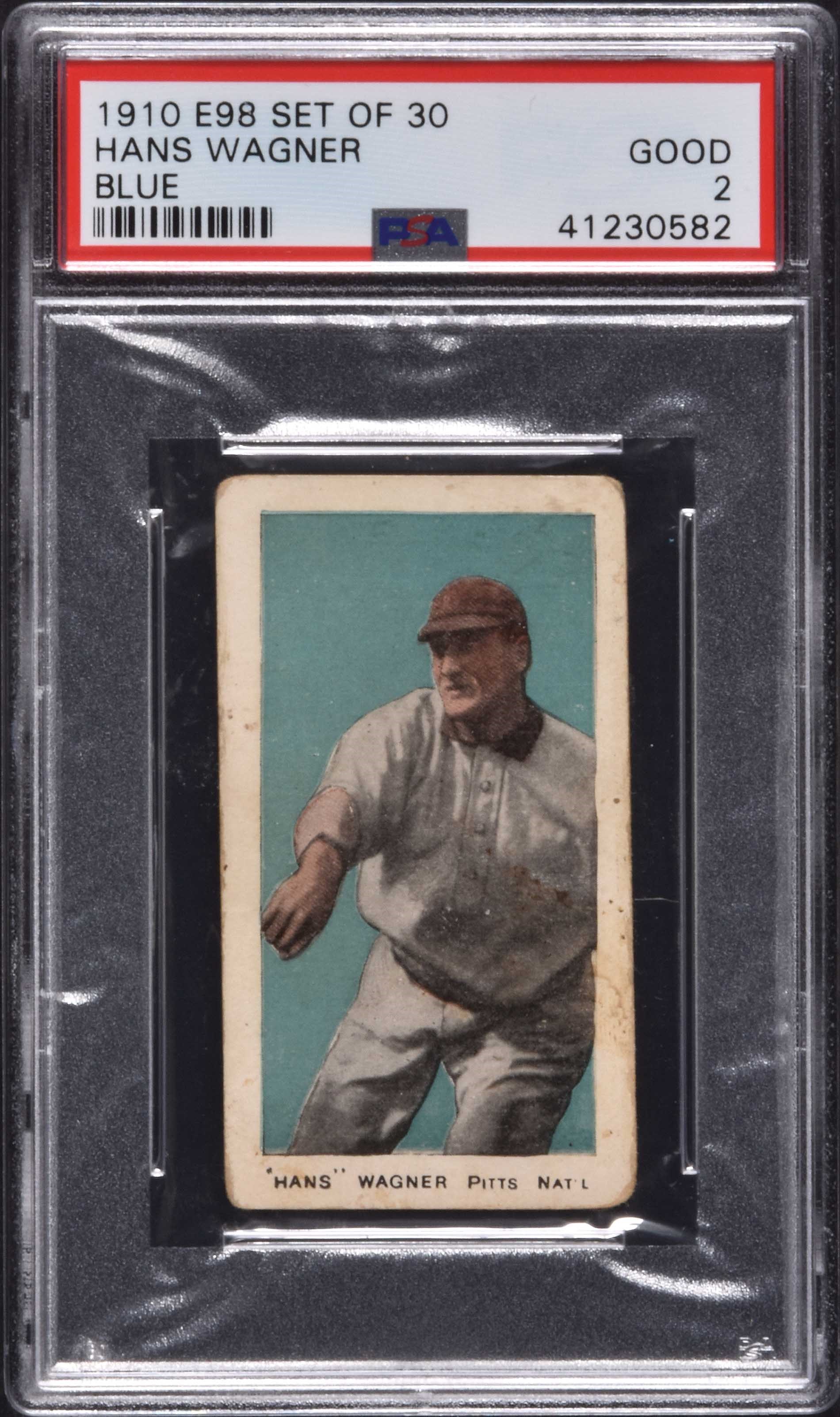 Graded GOOD 2 by PSA. Presented is a modestly graded example of Hall of Famer Honus Wagner from the E98 “Set of 30” candy-card issue featuring a very scarce and desirable blue background. The manufacturer of E98 is unknown, and the set may be easily confused with other caramel-card sets of the era (E93 and E94 specifically); this is an entirely different set even though it uses many of the same subjects and poses. For many years, E98s were among the scarcest of the 1910-era caramel cards, but the recent “Black Swamp Find” has changed the population dramatically. E98s have always been very desirable, and their increased availability and noteworthiness due to the find may have increased the demand as more collectors have become familiar with the set. The offered card is bright and crisp, with virtually perfect centering, even wear to the corners, and a crisp blue background. The reverse is fairly clean. Caramel cards in general are much rarer than tobacco cards of the era. Because they were issued with caramels one card per package and sold to children (as opposed to being sold to adults with tobacco), they also tend to survive in a much lower grade. This is a very attractive example of key Hall of Famer Honus Wagner from this extremely desirable early 20th-century candy issue. Reserve $500. Estimate $1,000+.